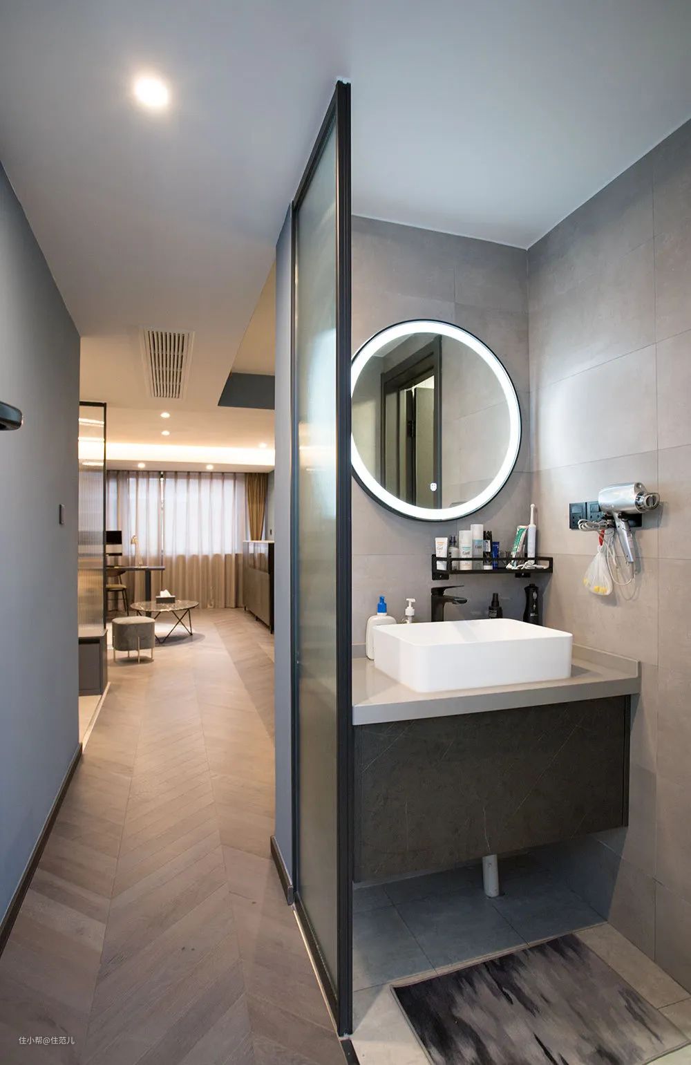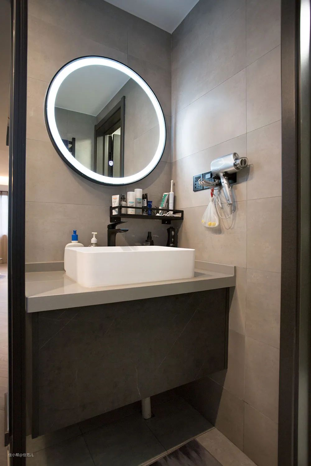 延续玄关高级黑白灰格调,浴室柜台面不大,客户自己搭了个简约黑色墙上置物架,满足日常洗漱用品收纳。