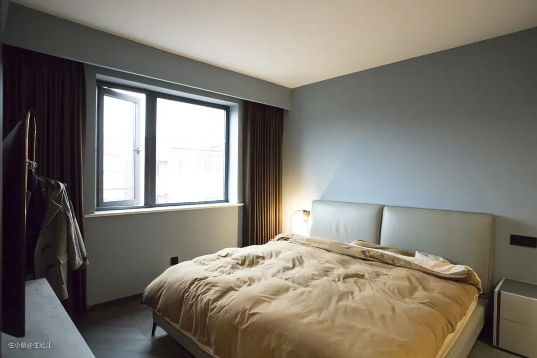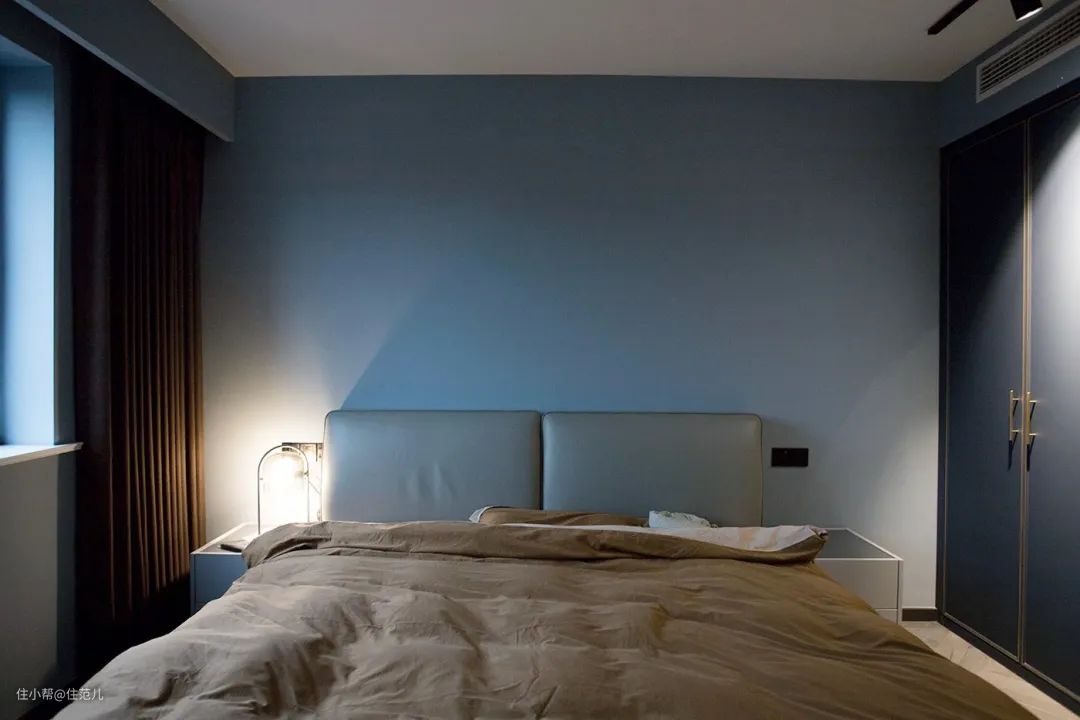 走进卧室,可以看出屋主非常清楚自己的喜好,依旧主色调贯穿全屋,但采用了饱和度更低的灰蓝色墙漆。