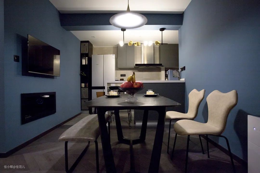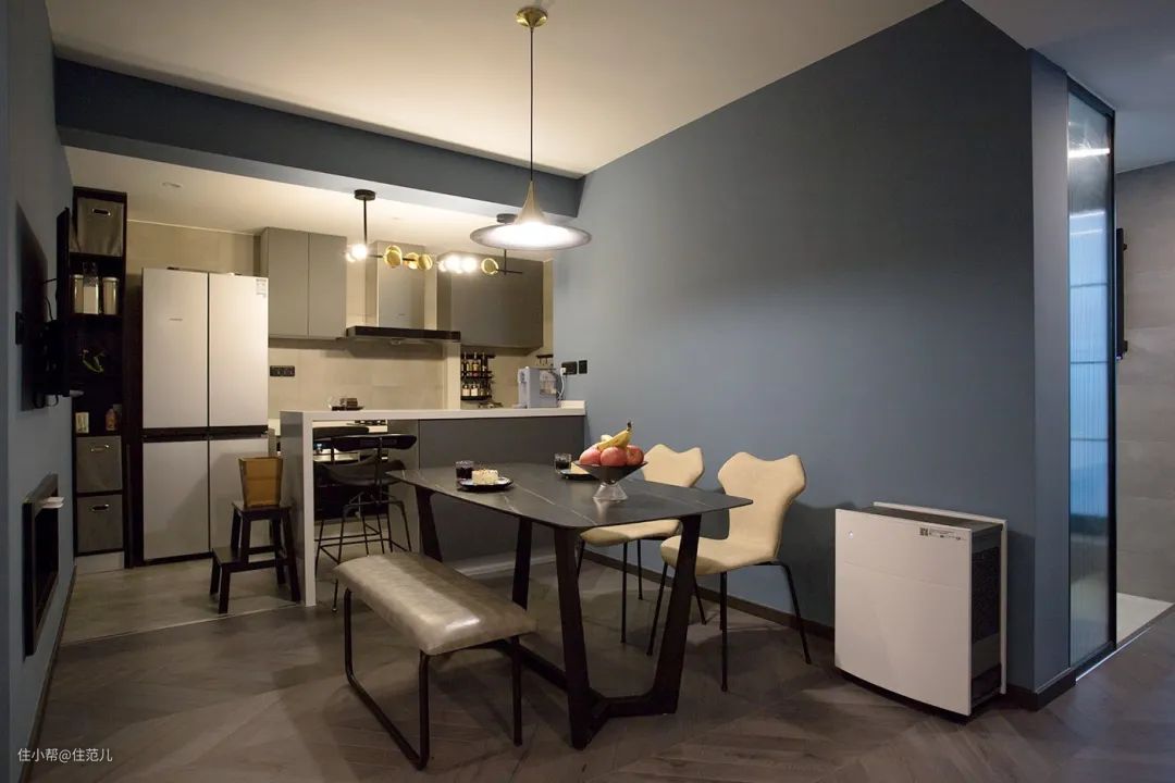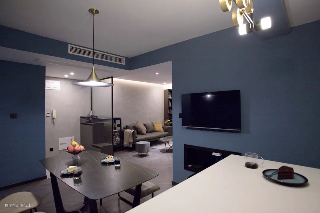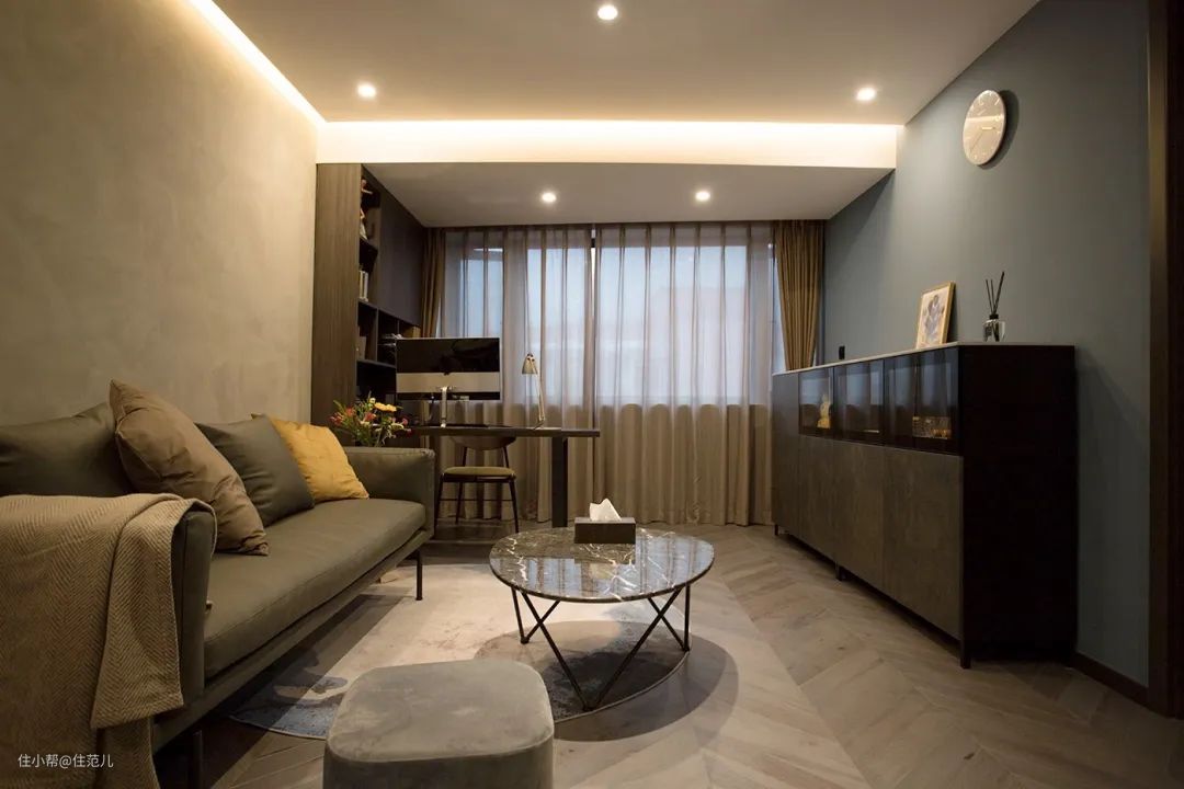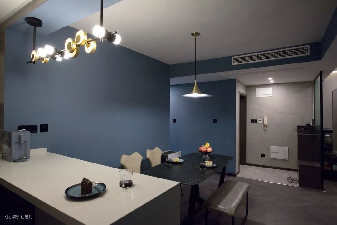 色彩选择上,通过使用不同层次的雾霾蓝和水泥灰,营造出冷静的全屋基调软装选配上,在定制柜外,选择石材、金属、皮质等元素提升质感。
