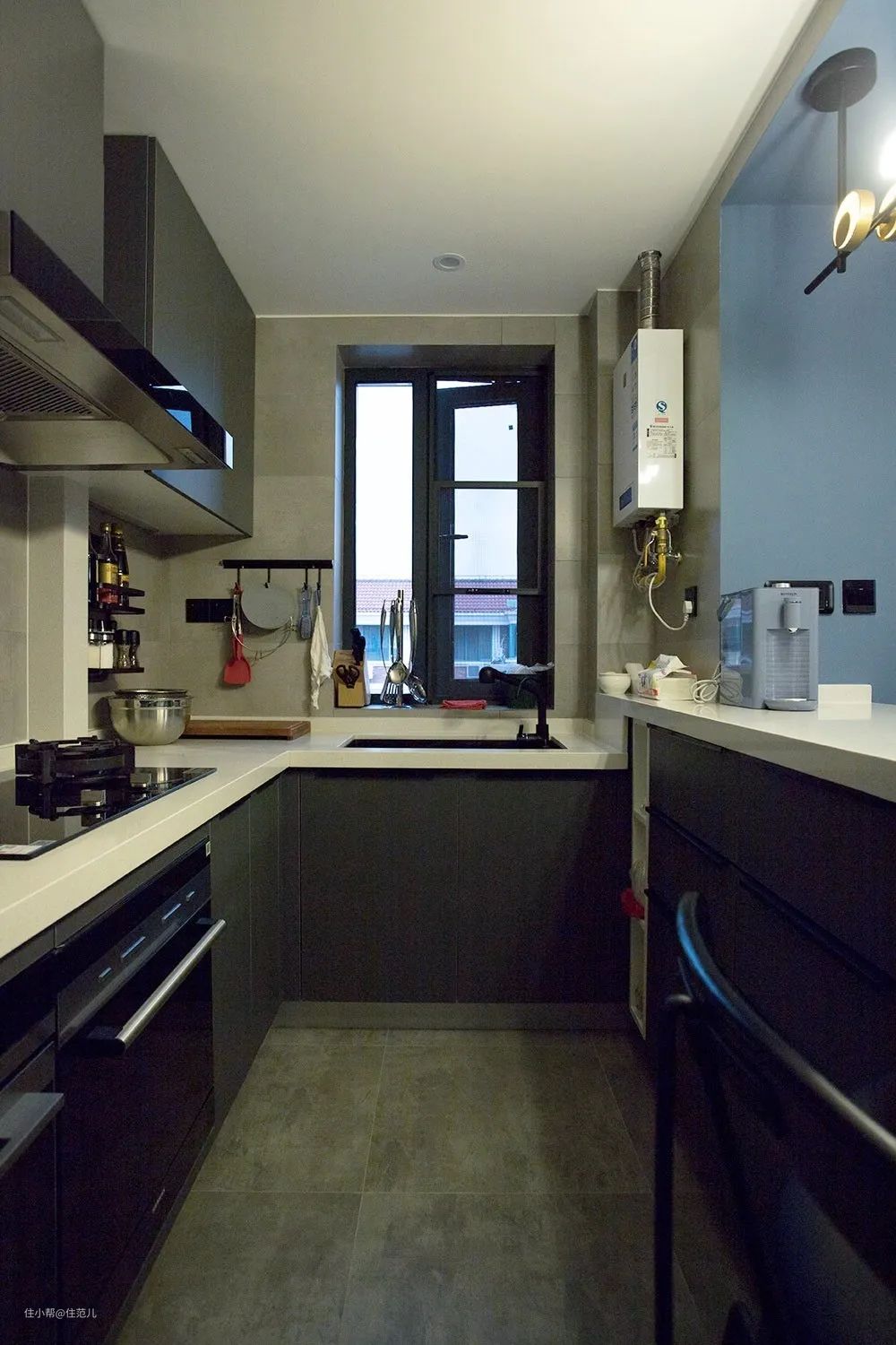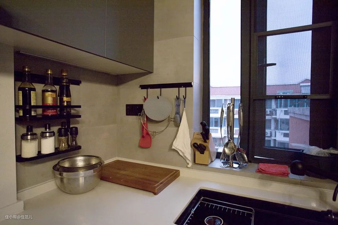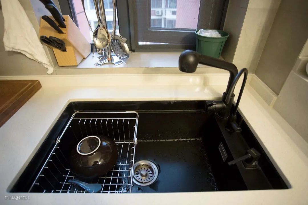 一系列黑色置物架,黑色石英石水槽,还有吧台上与墙面同色系的饮水机,屋主对整体统一的细节把控可谓做到了极致。