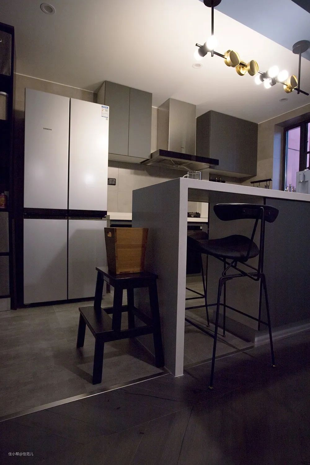 吧台入口西门子十字门对开冰箱,为了遮住冰箱斜后方的烟道,特意做了竖排开放格式收纳柜。
