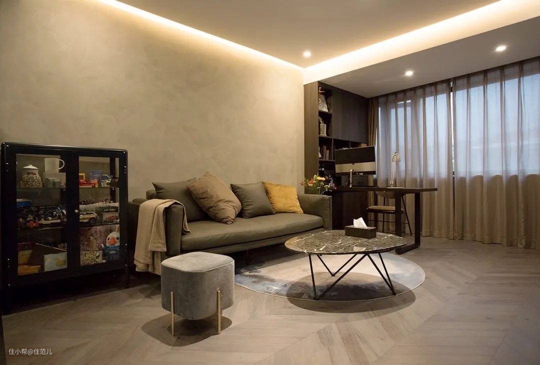 配色上,皮质沙发、天鹅绒矮凳、水泥墙组成了主基调灰色;纱帘、窗帘、书柜、地板又形成了第二组大地色系;沙发抱枕的颜色也以此确定下来。