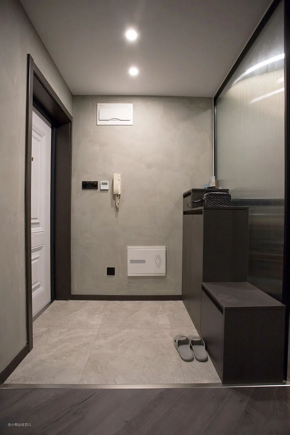 由于玄关整体配色比较克制,白色的强、弱电箱盖板并不突兀。