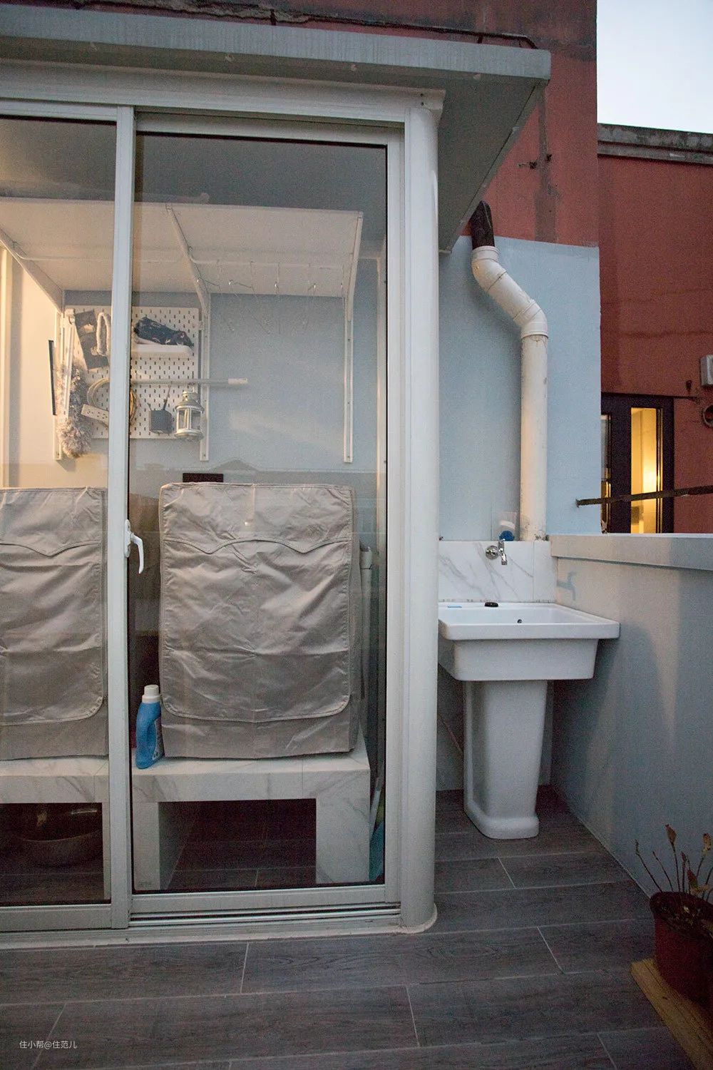 玻璃房旁边还有个外露的水池,平时在外面洗洗涮涮特别实用,尤其要接水管冲洗露台地面的时候超级方便。