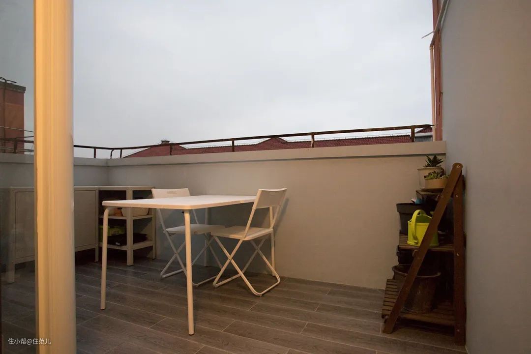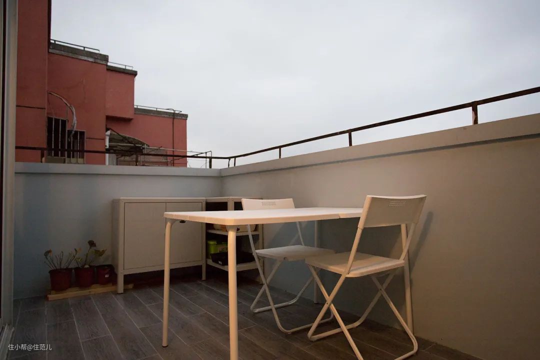 屋主家拥有一片开放式露台,有休闲桌椅,有耐潮的铁皮收纳矮柜,有花花草草。