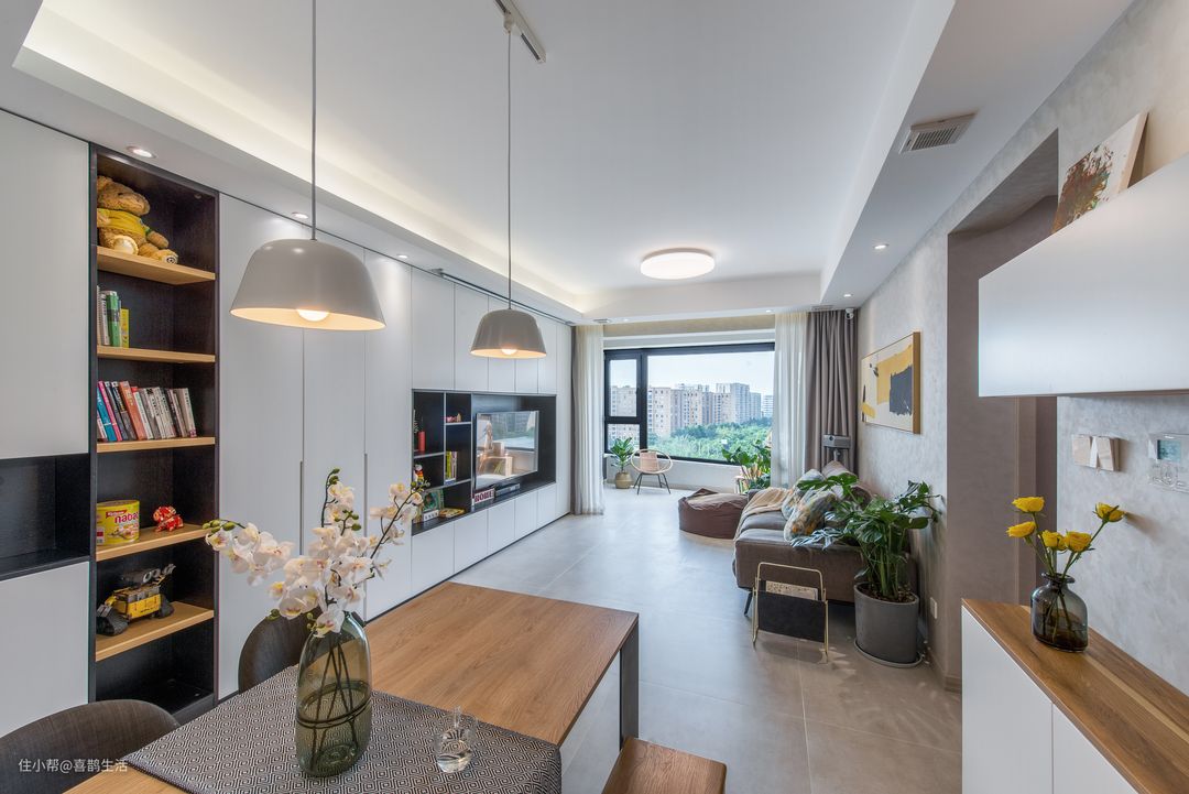 这个客厅,异常简单。入户一侧是一整面墙的厅柜,杂物都收了起来,让家更美观还能方便取用。搬家的时候,小米辣8个月,正是在地上爬来爬去的年纪。家里根本没买茶几,就是为了有足够多的空间让她爬。
