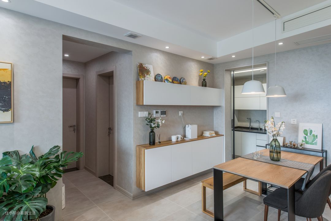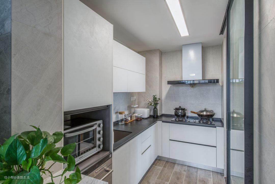 厨房空间小,采光也一般,在经过整改后做成了L型,颜色做了黑白配,与餐厅之间用玻璃移门连接,让整个空间明亮。