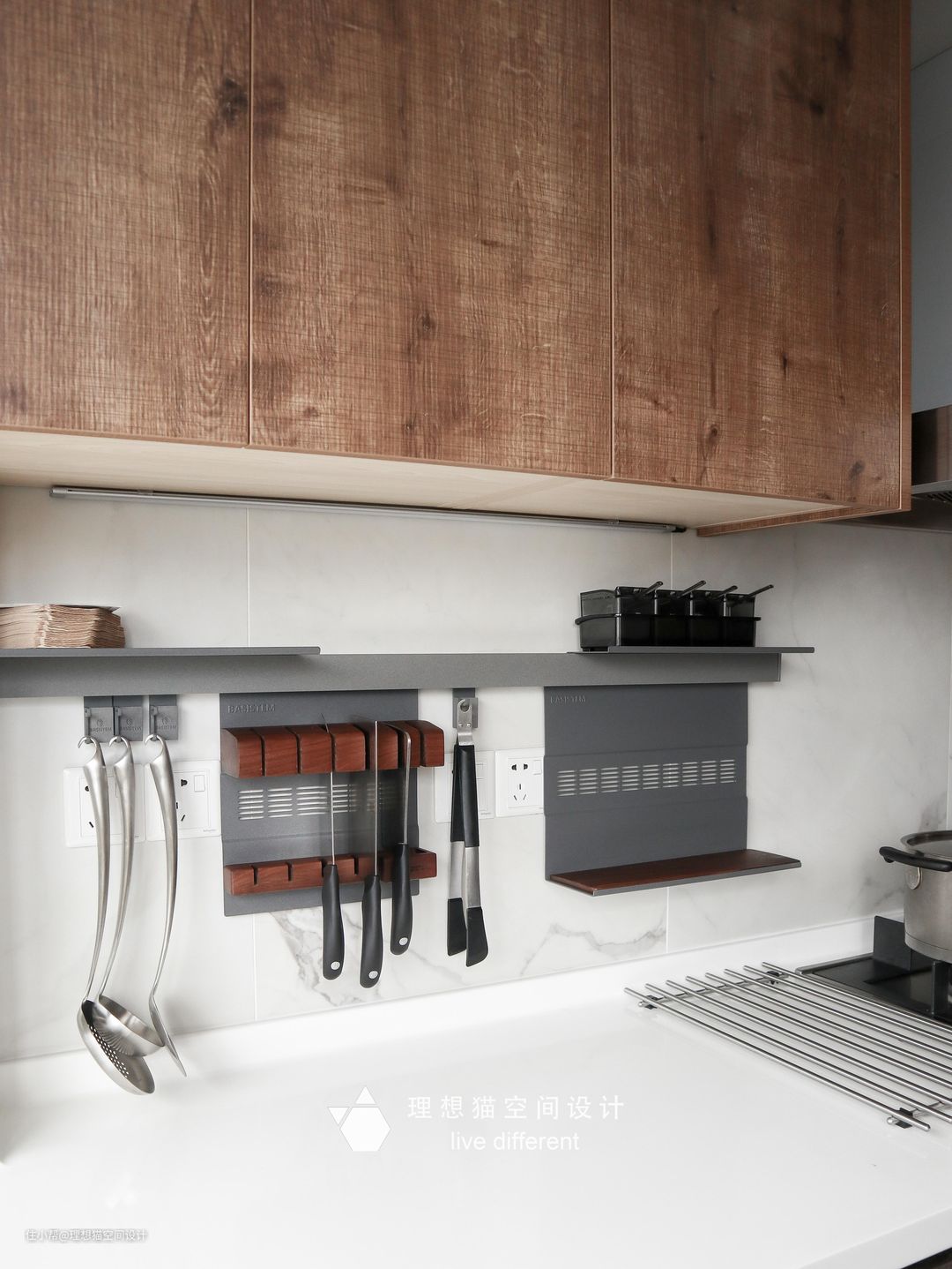 柜门和开架的设置,在立面设计上精心调整比例,形成了虚与实的对比,使得整面的储物柜不至于太过沉闷。另一方面也在功能上满足了不同物品的收纳需求。