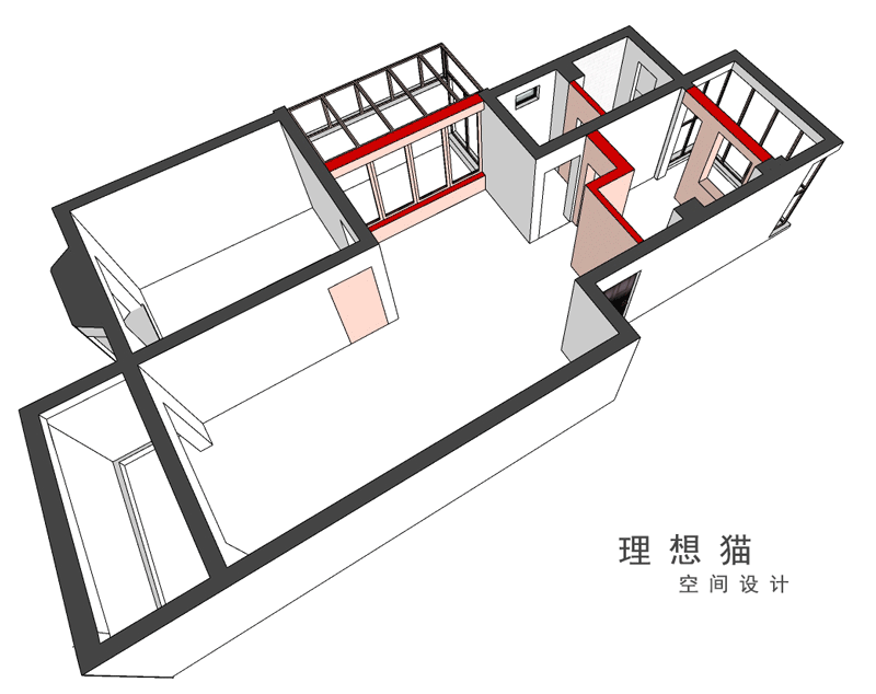 • 我们首先把厨房与客餐厅之间的非承重墙拆除,作为开放的中厨;餐厅与相邻的阳光房合并,成为西厨和客餐厅一体的LDK空间。