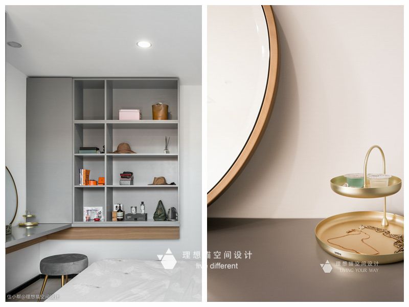女主卧床尾沿墙布置一圈整体储物柜,收纳当季的衣物、包包、香薰、以及各地旅行带回来的帽子、摆件等。
