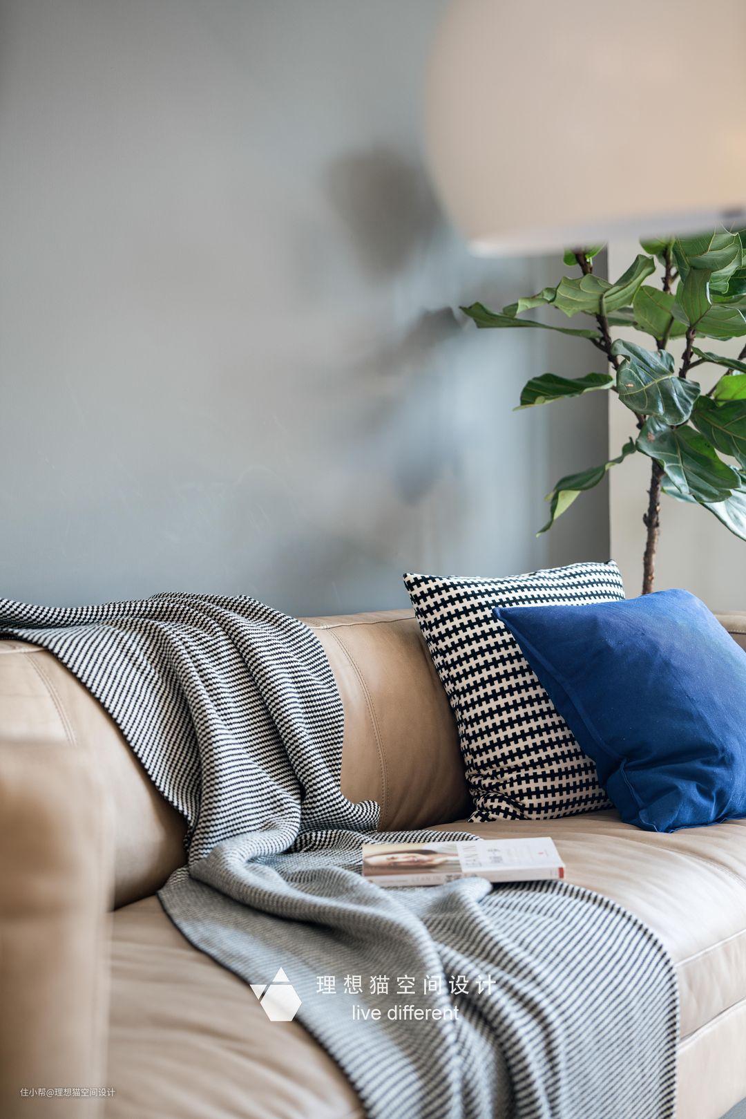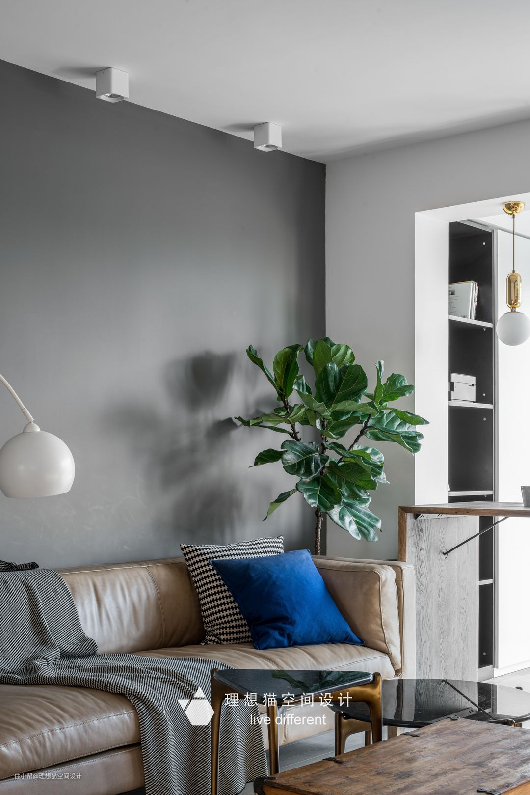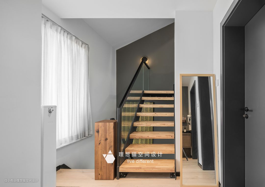 客厅沙发后的深灰色的背景墙一直从楼梯洞口延伸到二楼。深灰色整面空旷的留白,孤单的树影,形成独特的视觉张力。