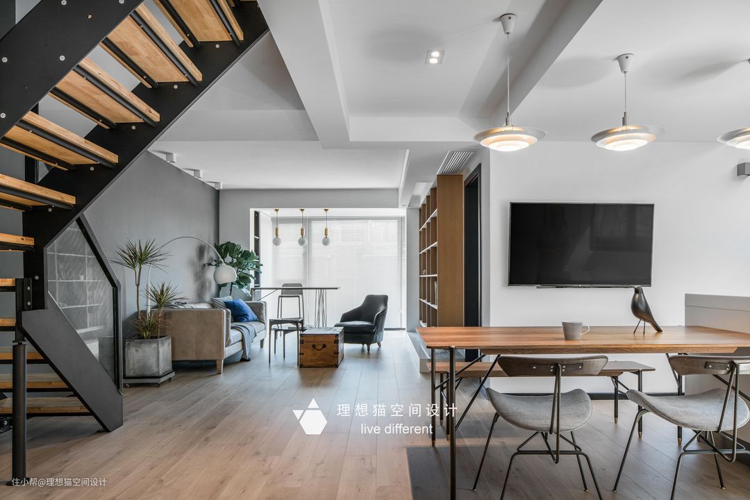 楼梯由原先的实木楼梯换成了钢结构,书架底部架空,暗藏有灯带。吧台、餐桌、椅子的脚也都是精心挑选细细长长的,整体创造出一种悬浮的轻盈感。
