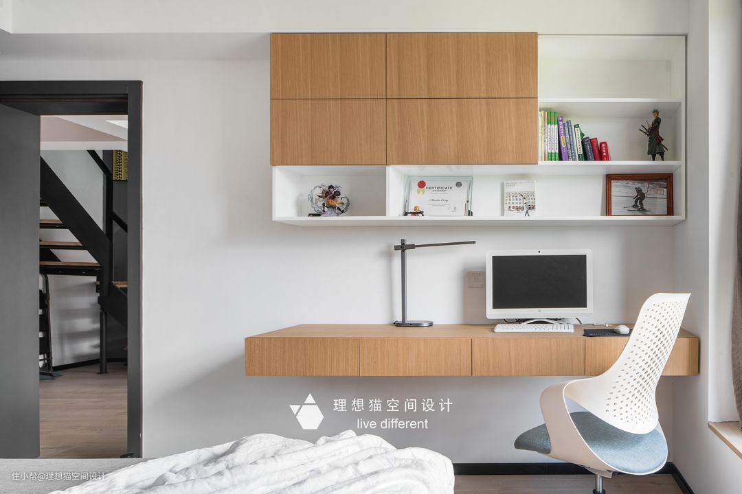 写字台和书柜延续了客厅的风格,“悬浮”起来,房间显得更加通透干净。