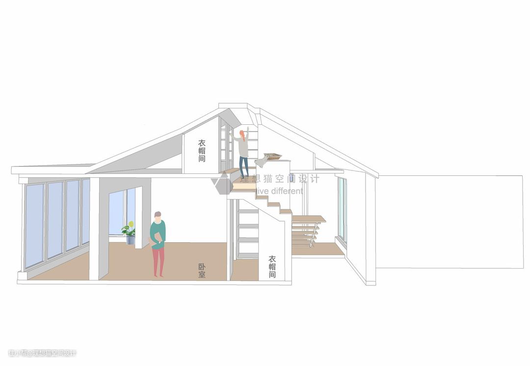 设计在保证2F起居正常高度的情况下,扩大了原2F男主卧的衣帽间,衣帽间的层高适当降低,给阁楼匀出了人站立行走的足够高度,而层高不够的两侧则作为挂衣储物区。