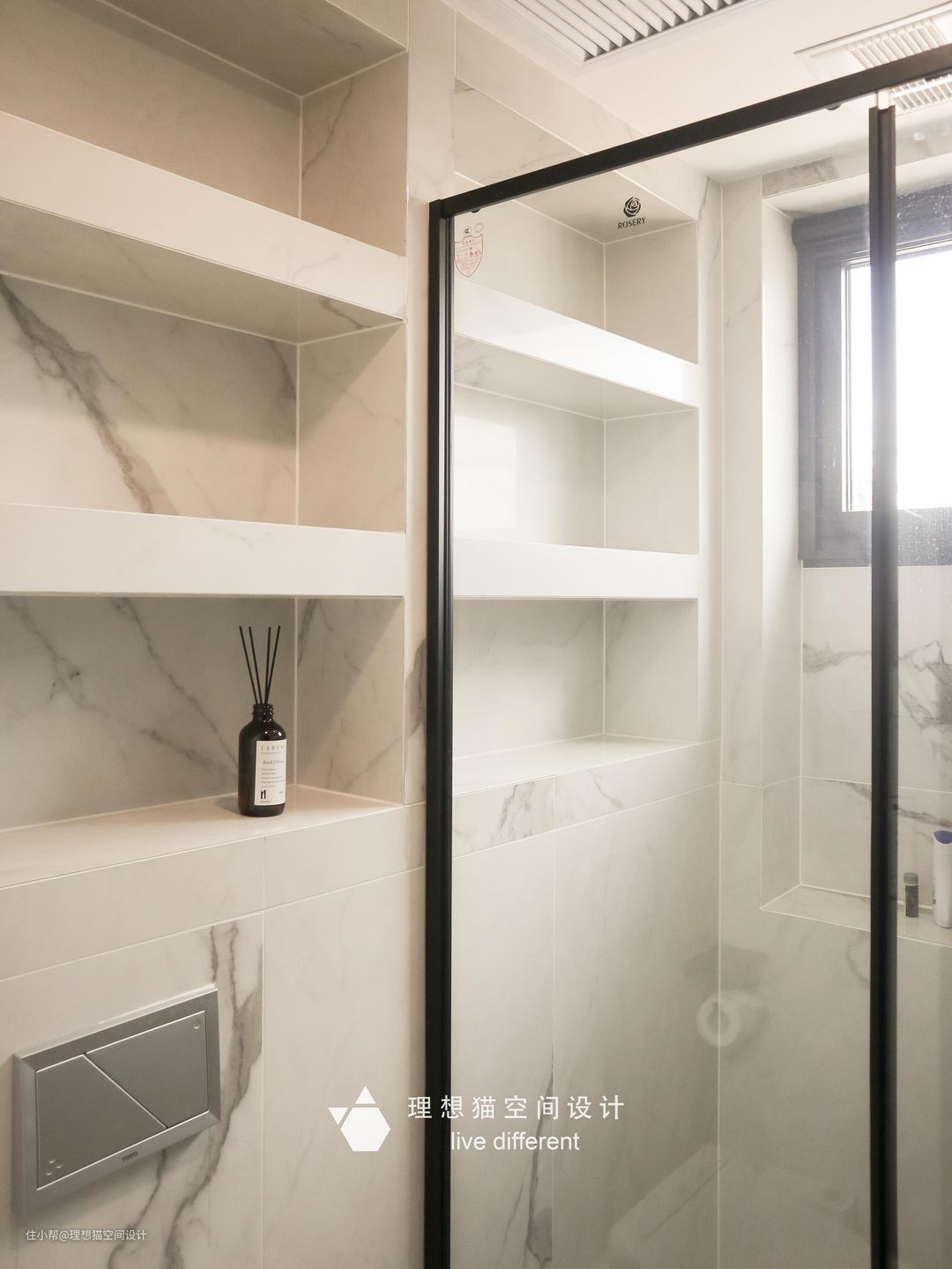 结合墙排马桶的水箱设置了壁龛,可以放置大量的洗浴用品。