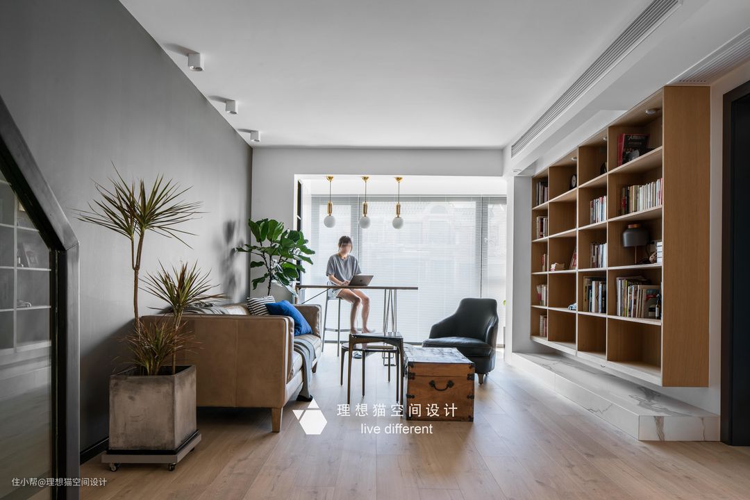 经过岁月抚摸的温暖木质和斑驳的结疤,中和了黑白灰的硬朗,为整个客厅空间带来了恰到好处的故事感。