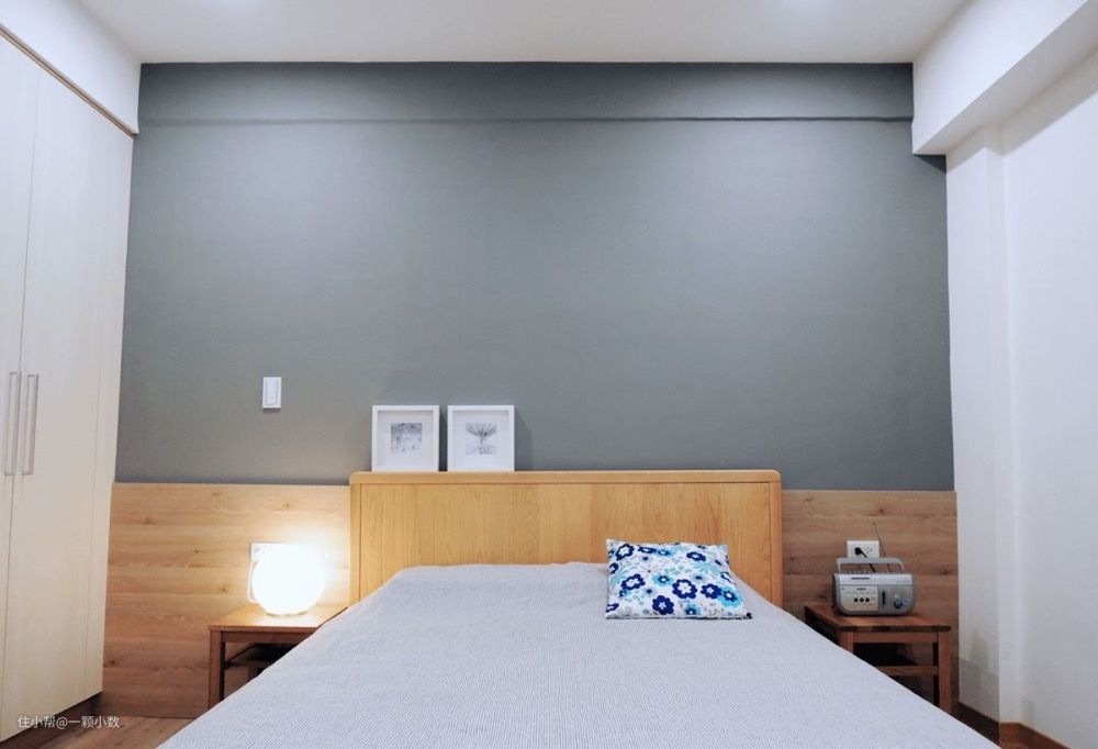 改造后的卧室,床头背景墙刷成了灰色,搭配原木色的护墙板,显得格外温馨。
