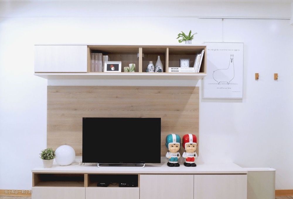 电视背景墙都利用起来做收纳,开放式格子柜与抽屉组合搭配,满足你不同的储物需求。白色搭配木色,自然清新、舒适宽敞.