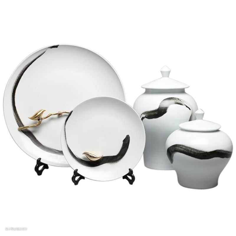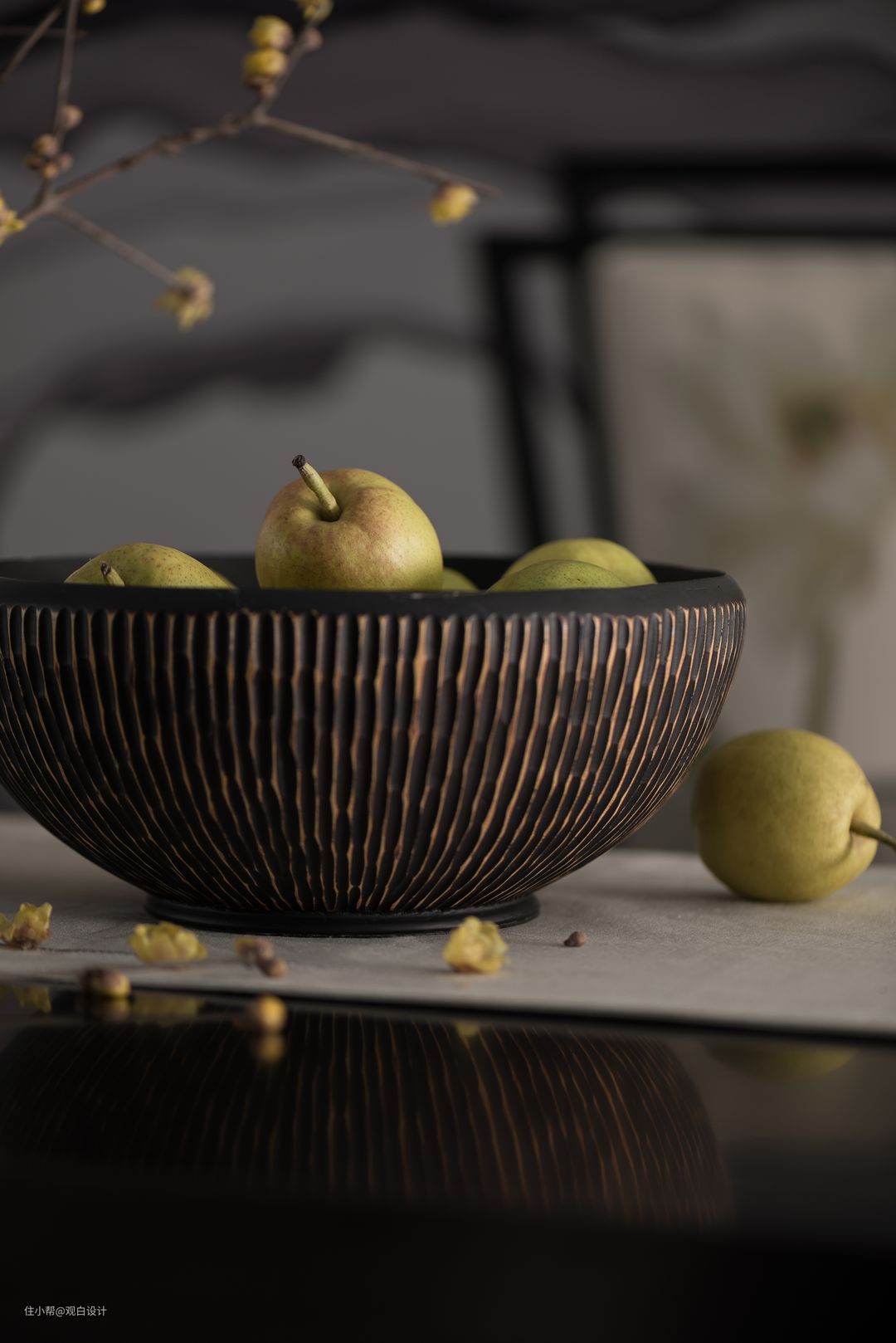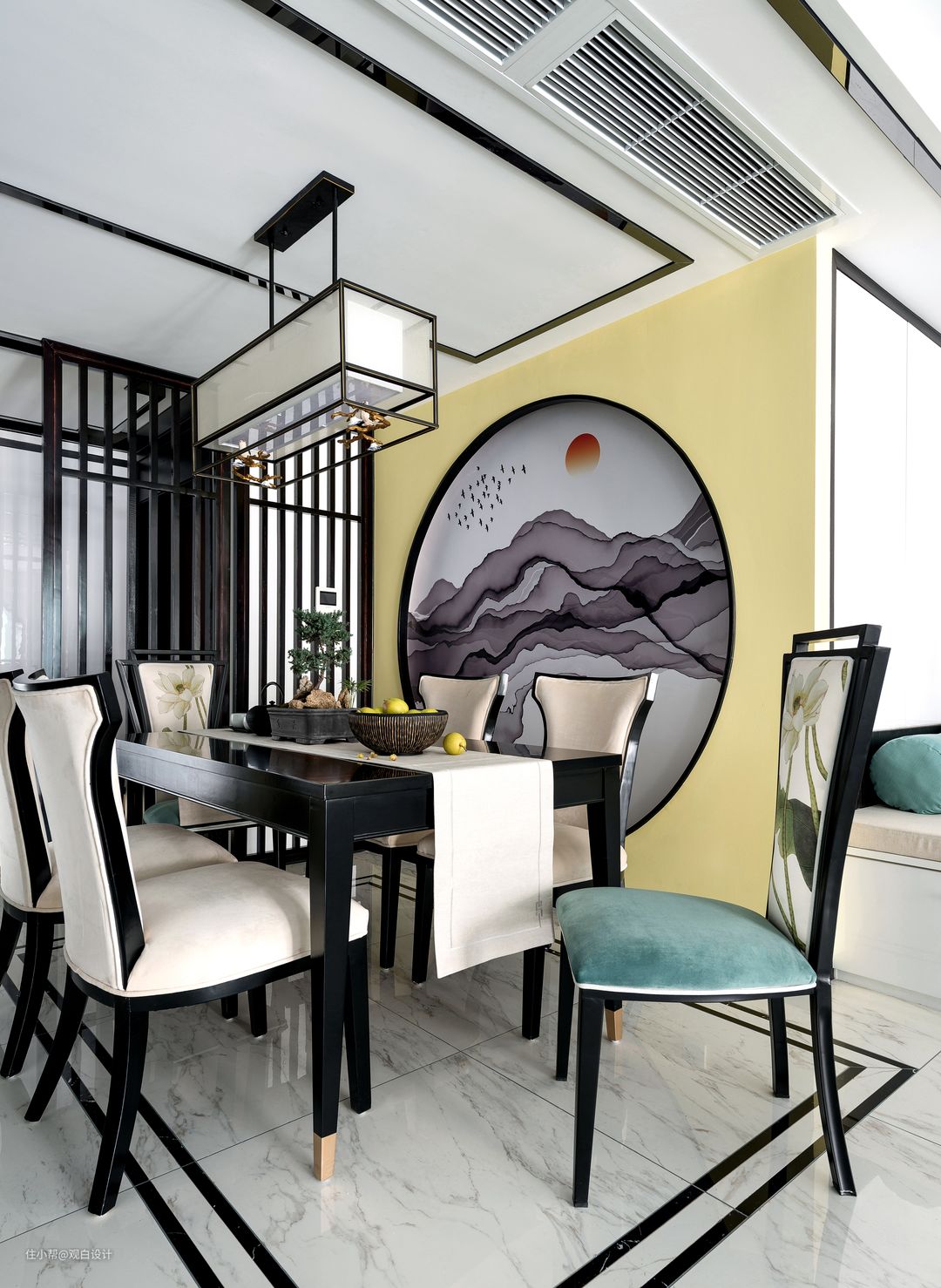 圆,有圆满之意,确切符合了中国人内心深处的向往,餐桌背景做了一个圆形造型,配上水墨山水墙画来达到意境。