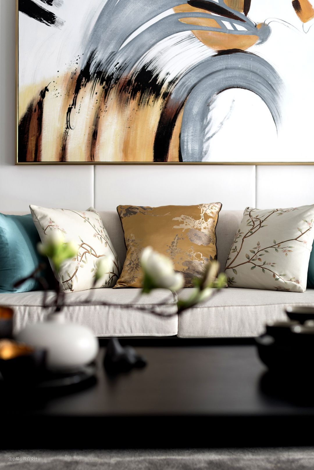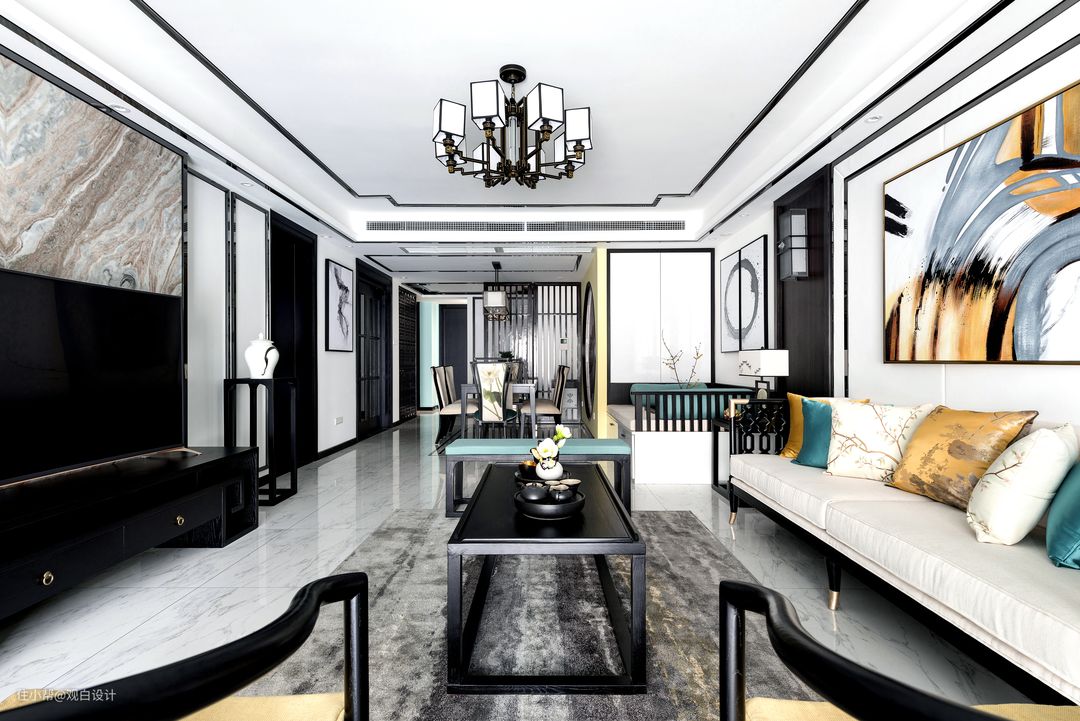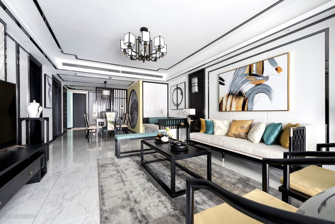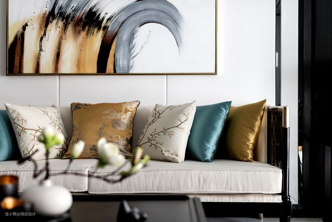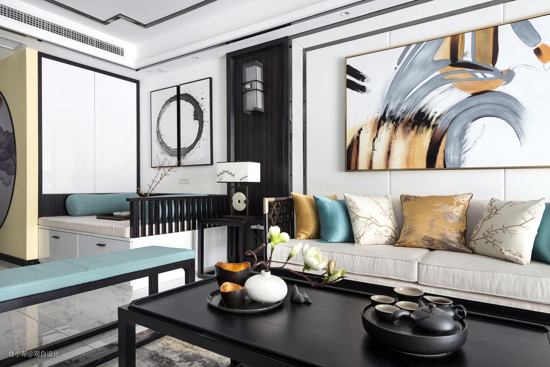 用黑色不锈钢条来构建轮廓骨架,整体造型简洁,通过大面积白色和黑色的对比形成色彩层次,沙发背景墙白色皮质硬包属相分段,拉伸视觉高度。白、绿、黄、黑色彩交相呼应达到视觉平衡。