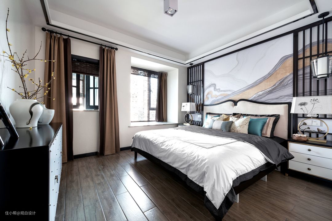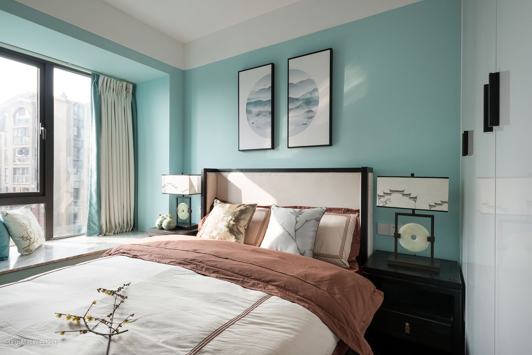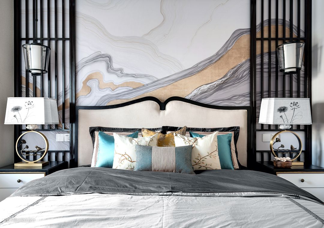 卧室主要通过软装来达到风格视觉效果,没有繁琐的造型,简单易换。