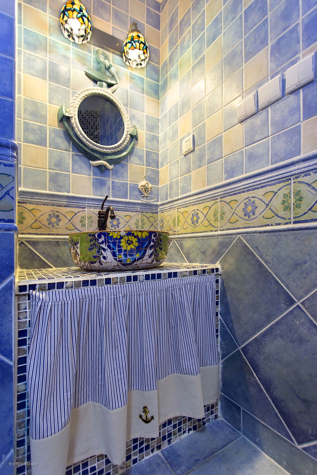 蓝色墙地砖,船舵镜子,洗脸像是在海边玩水,这感觉真好