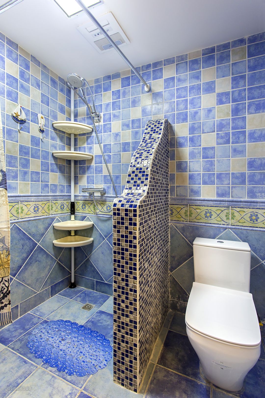 蓝色的墙地砖象征着海洋,贝壳马赛克的隔断,柔软的线条,这是在复制一个海洋吗