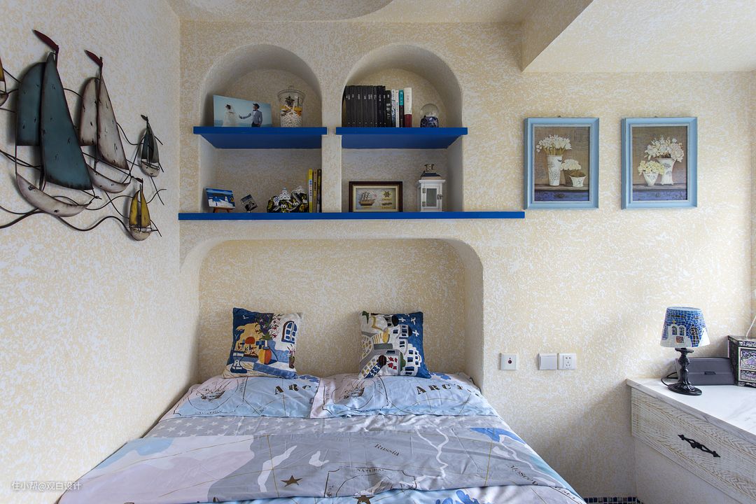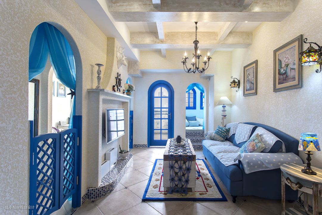 业主两口是80后,经常穿梭在地中海沿岸,所以风格风格自然而然就锁定了地中海风格,父母就住在附近,所以不需要太多的房间,小两口自己居住即可,小朋友也是长辈带,很少在家作饭。自由奔放、色彩多样明亮,以海水蓝为主的纯正色调,让人意蕴在无限的希腊海边风光中,无拘无束。拱形门洞,做旧的墙面和木头,带着浓浓的历史沉淀。此案空间不大,通过对户型的改造加大视觉空间,互相借景,细节的小布景增加空间的趣味性。