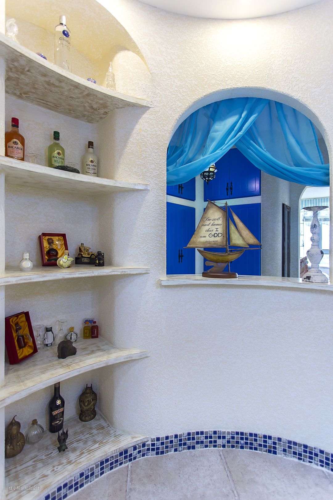 特殊设计的壁龛,展示从希腊带回来的纪念品,满满的都是回忆,蓝色空间蓝色衣帽间和外面的白墙层次清晰。