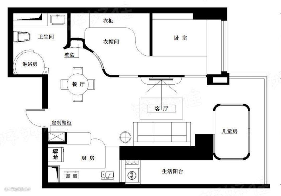 开放厨房,开放衣帽间,开放卧室,以及在阳台独自搭建的开放儿童房,每个视觉点都能延展,通过吧台来区分餐厅和厨房,通过拱形小窗和门来区分卧室衣帽间和客厅,视觉的窗口就这样打开了,一切都是那么舒畅,啊.......感觉一下就自由, 没有被约束的感觉真好