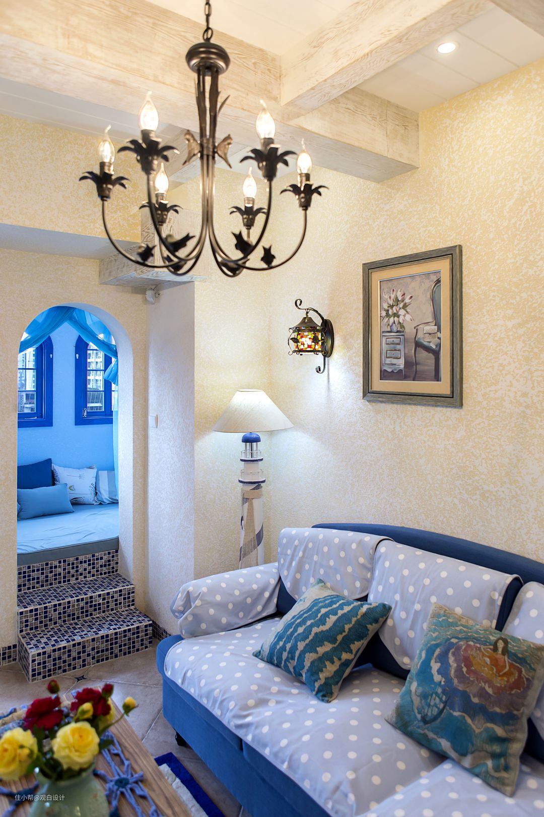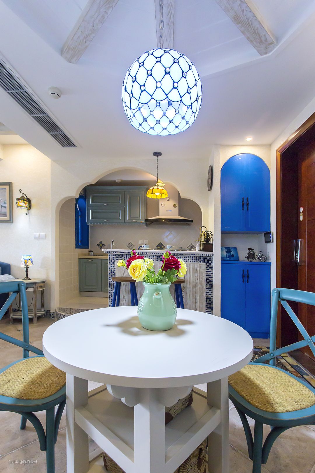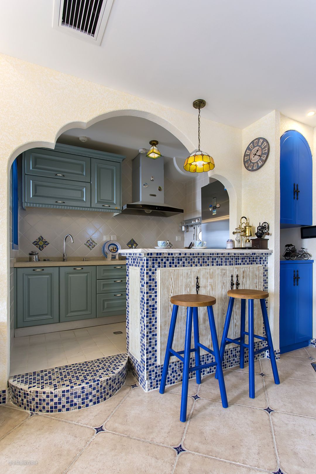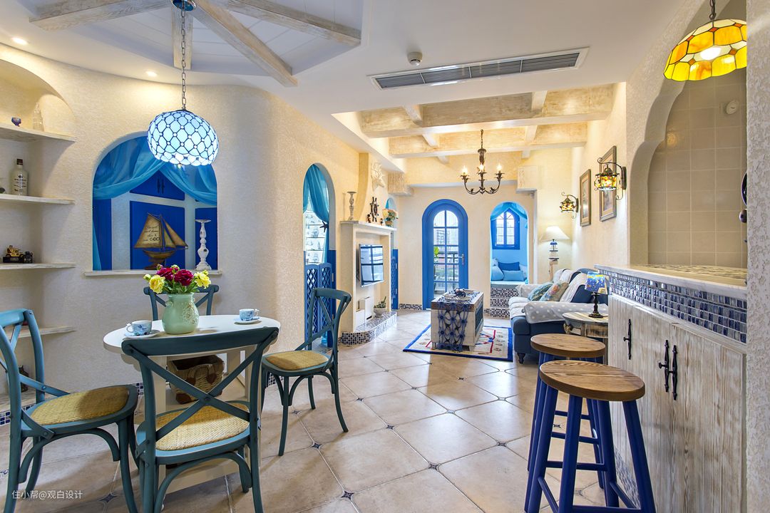 业主两口是80后,经常穿梭在地中海沿岸,所以风格风格自然而然就锁定了地中海风格,父母就住在附近,所以不需要太多的房间,小两口自己居住即可,小朋友也是长辈带,很少在家作饭。自由奔放、色彩多样明亮,以海水蓝为主的纯正色调,让人意蕴在无限的希腊海边风光中,无拘无束。拱形门洞,做旧的墙面和木头,带着浓浓的历史沉淀。此案空间不大,通过对户型的改造加大视觉空间,互相借景,细节的小布景增加空间的趣味性。