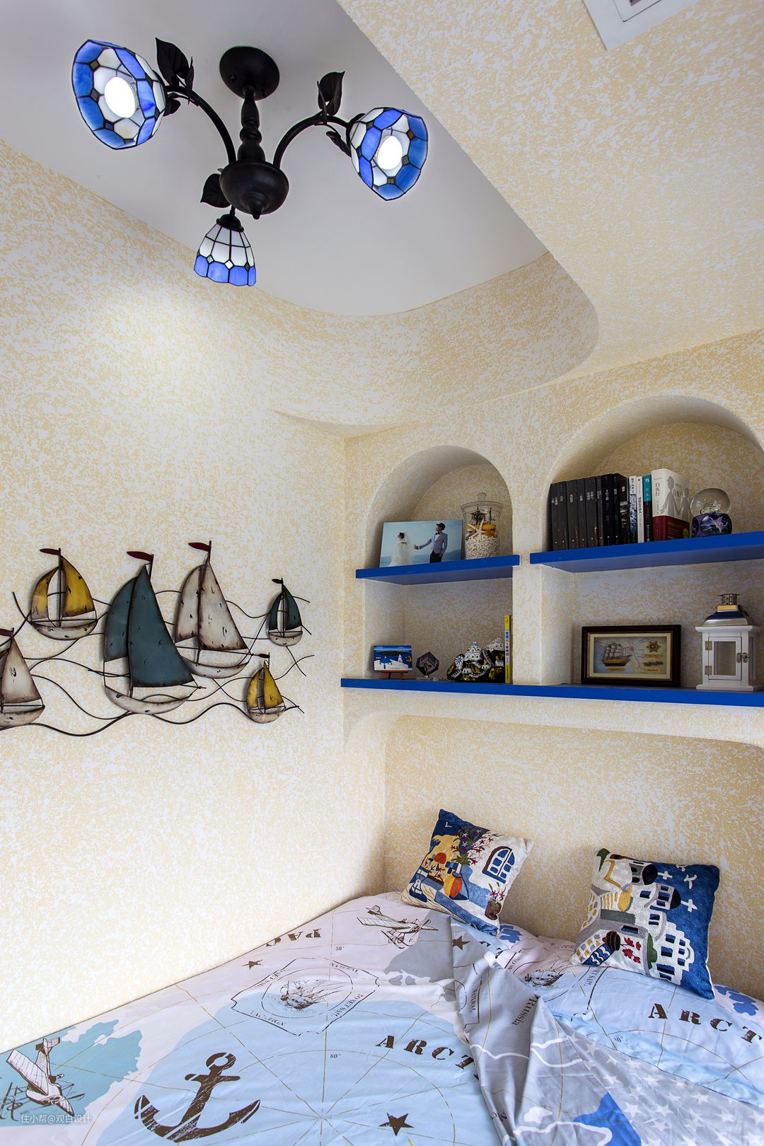 蓝色窗纱分隔,蓝白相间的搭配,加上暖色的灯光,一切都是那么自然。