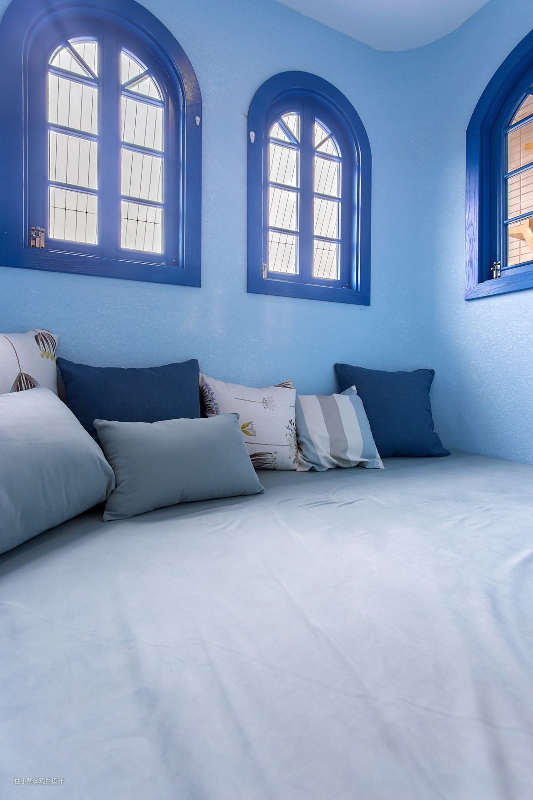 特殊设计的壁龛,展示从希腊带回来的纪念品,满满的都是回忆,蓝色空间蓝色衣帽间和外面的白墙层次清晰。