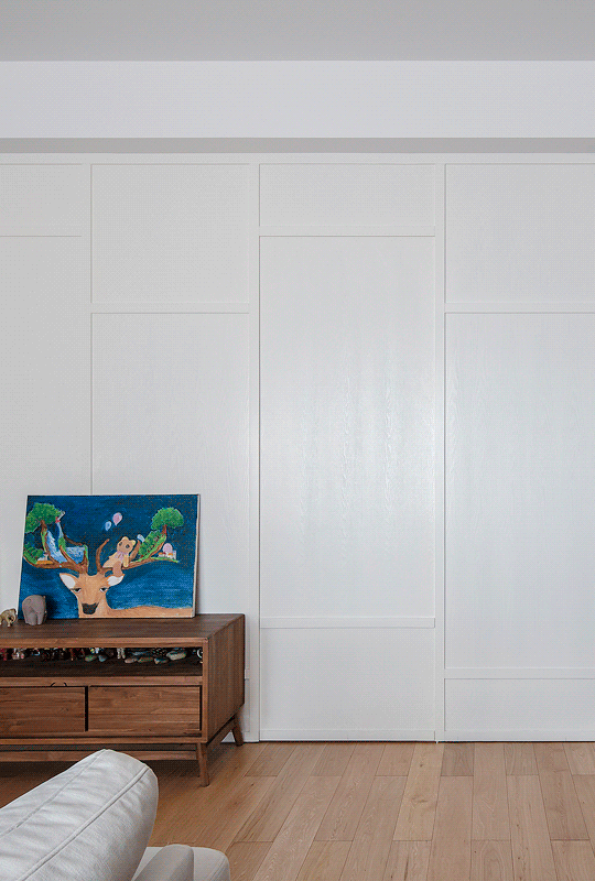 关上门便是完整的纯白幕布,推开门来,里面是温柔粉嫩的女孩房。