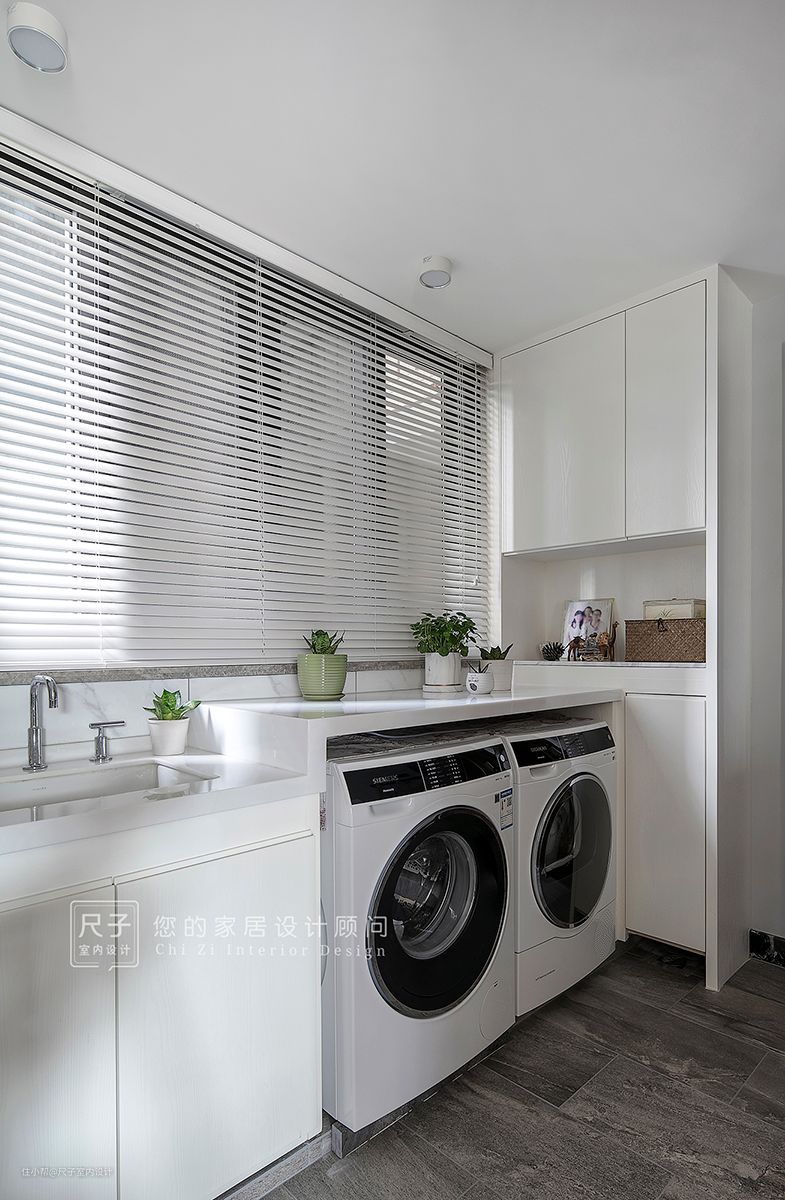 从室外进入到室内,这里既是玄关改造后也是洗衣房,清清浅浅的白色,百叶帘带来光影的变化,这便是我们对这个家的第一印象。