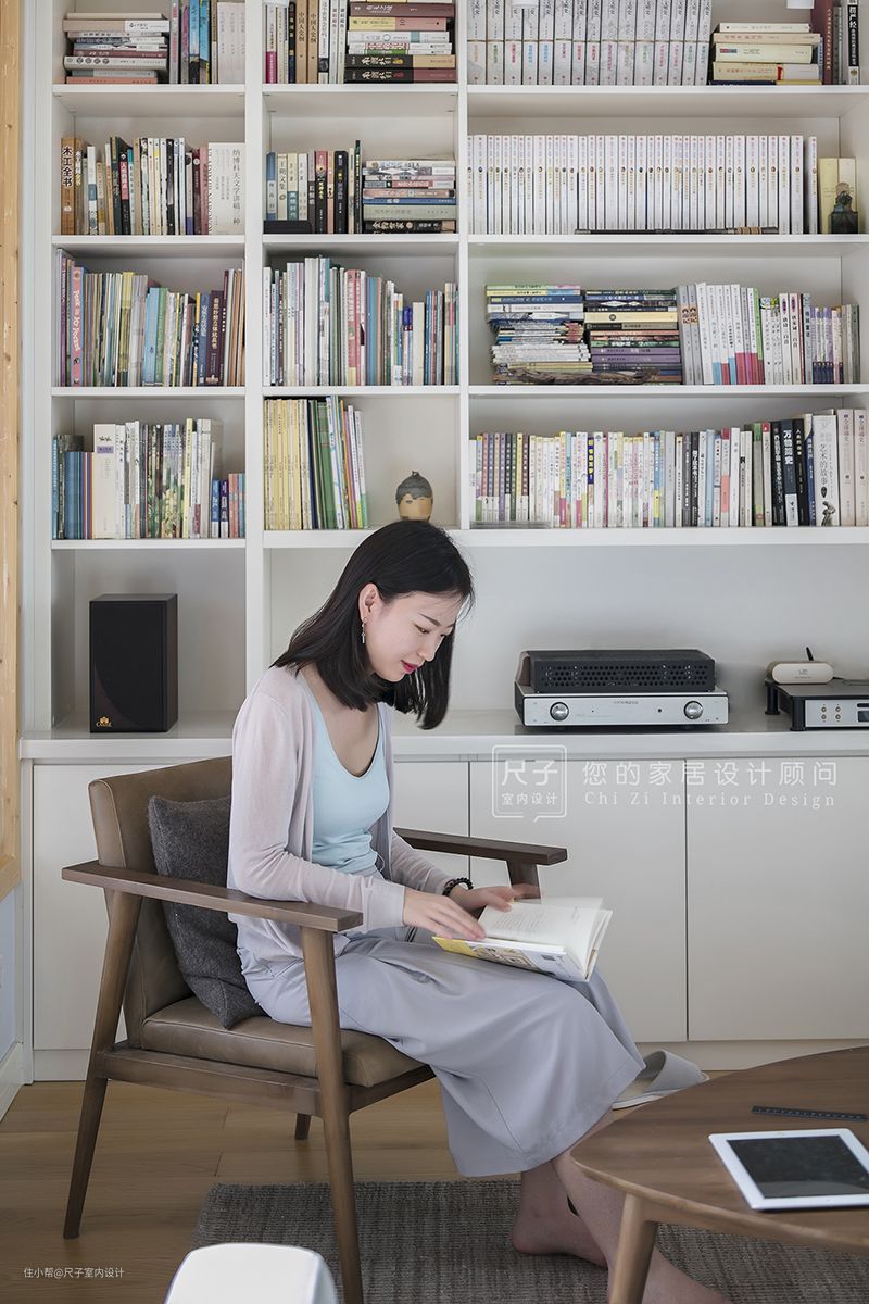 为了让家里的藏书有个安身之地,也是为了培养孩子的阅读习惯,定制这整面墙的书柜;对于A小姐来说,吹着空调坐着看自己喜欢的书,抬眼就能看到Y先生与孩子的身影,是极大提升幸福感的事儿。