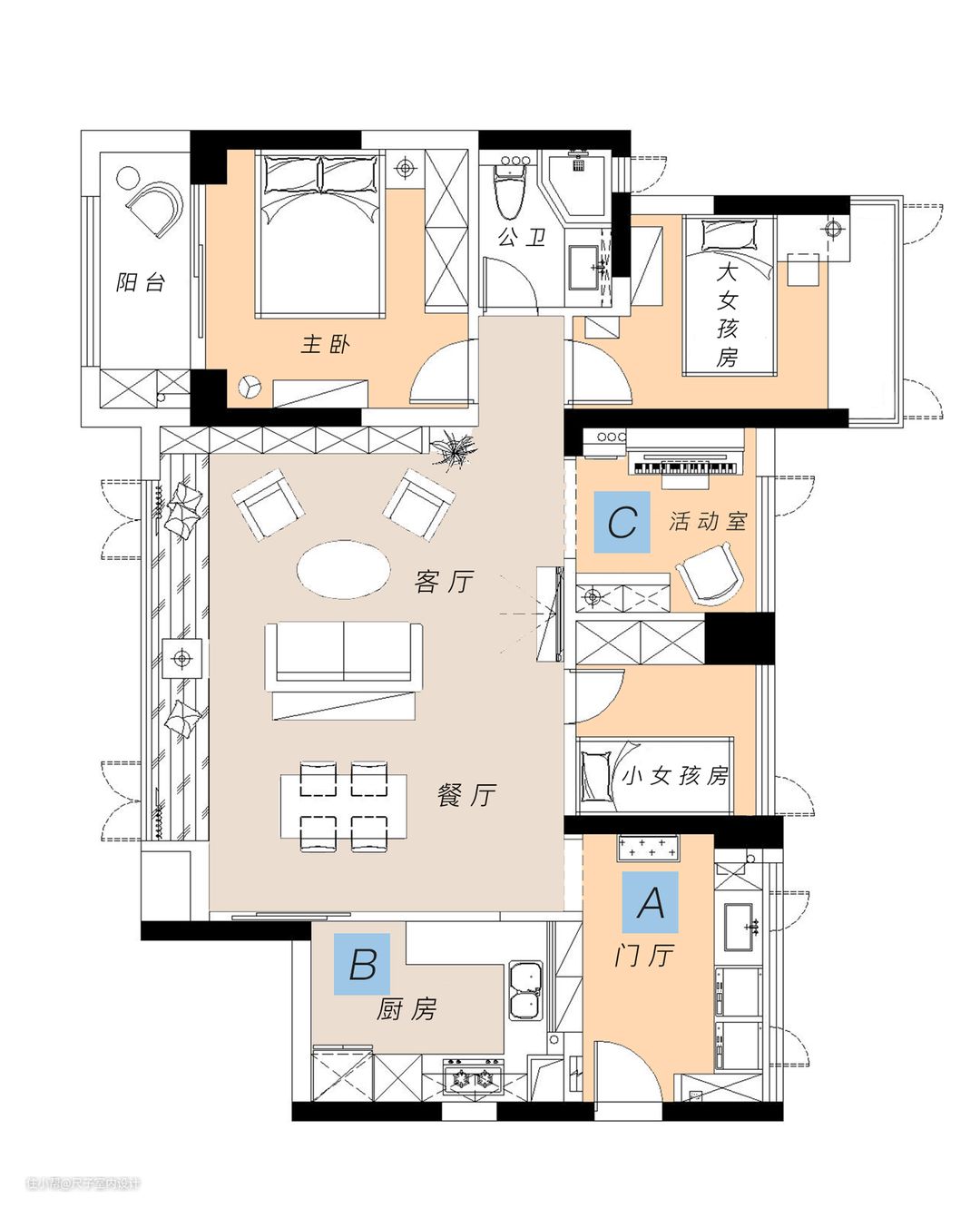本案例改造的重点是这三个区域:玄关、厨房、活动室