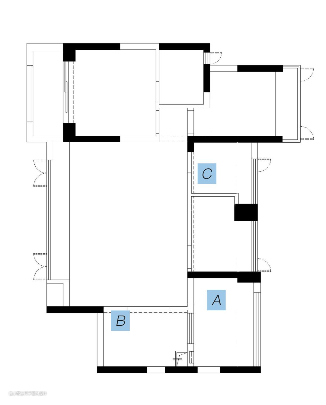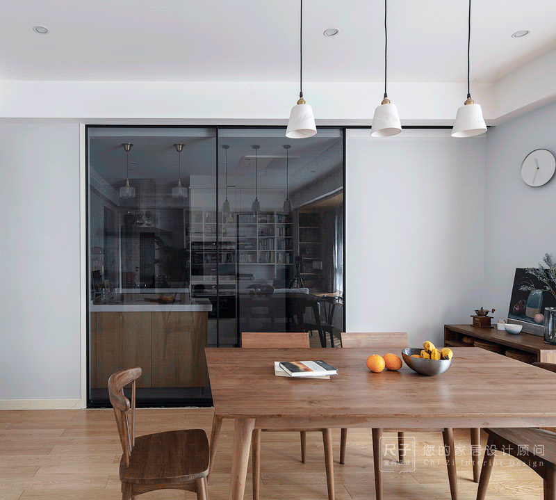 B、原厨房采光较差,与客餐厅有很大的距离感,我们将厨房墙面拆掉做灰玻推拉门,增加采光
