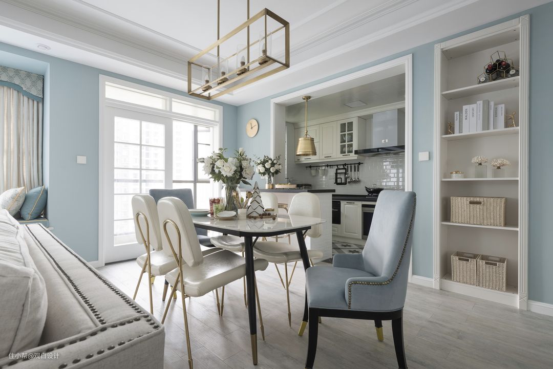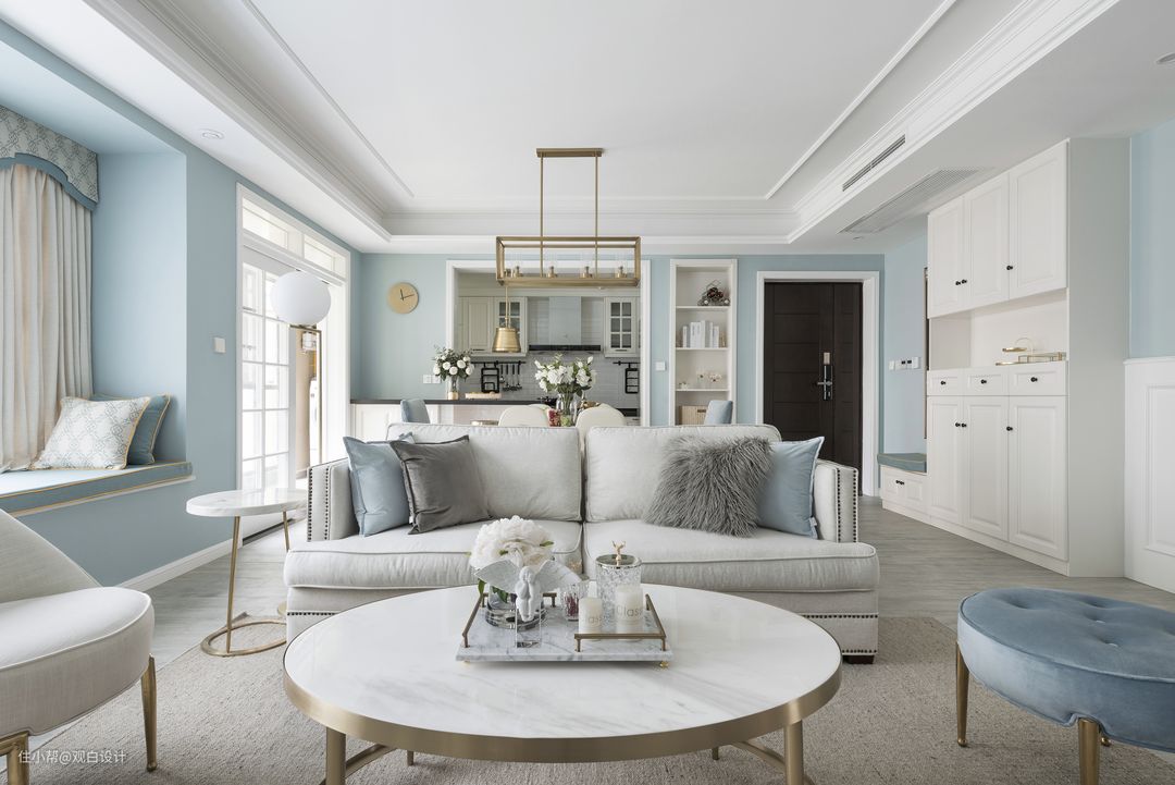 在本案中,设计师摒弃了传统美式风格木制做旧家具,将现代美式的白色家具和金属质感的时尚元素结合起来,同时公共区域的家具等软装饰品,相对选择了较多金沙色和蓝色的元素来装饰和丰富整个空间的效果和层次。而这一元素体现了家的美好精致。反之卧室的软装搭配则需要简而精,因为属于较为私密和休息的区域,简约和舒服为主。