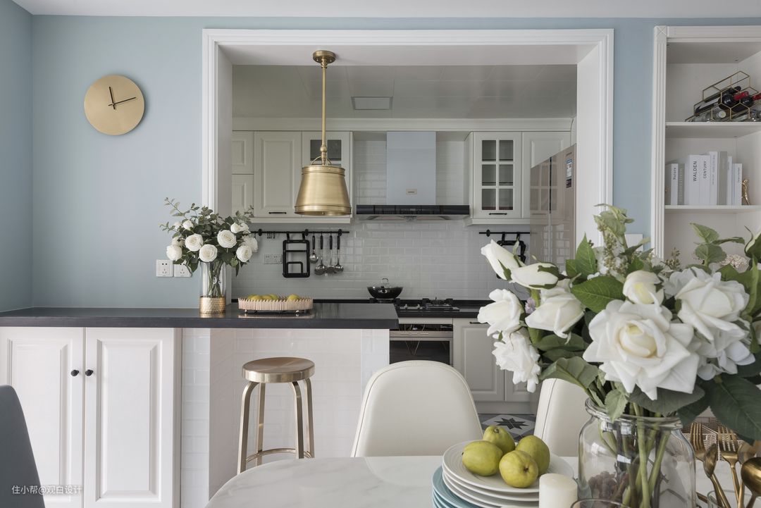 1.业主两人共组忙碌,在家做饭时间少,于是设计师打通封闭式厨房,以岛台代替隔墙,让厨房与餐厅之间隔而不断,整体空间更显通透宽敞。
