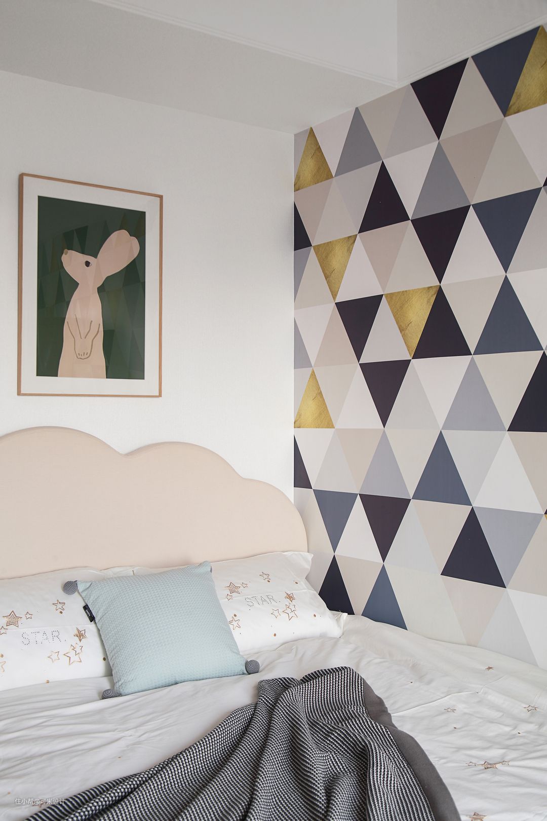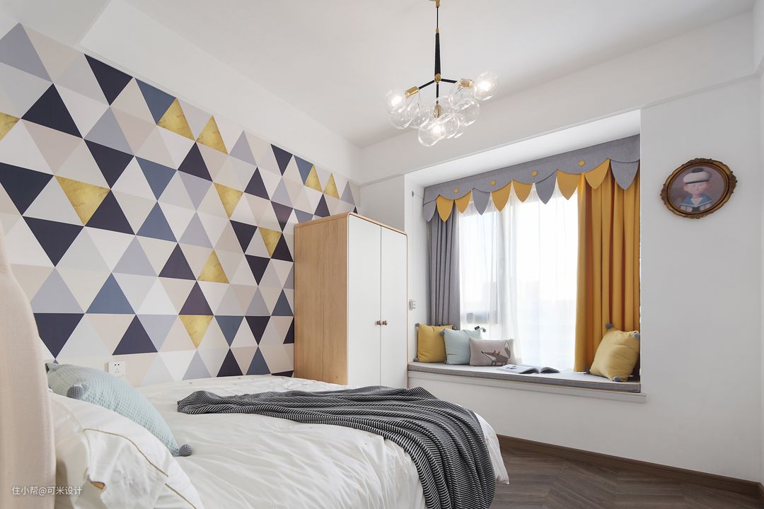 我们在一面墙上定制了多彩的壁纸,三角形+丰富的色彩,可以给孩子带来更多遐想的空间。房间内购置了一款两门衣柜,采用了弧形元素,圆润可爱,增加了屋内的收纳空间。窗帘采用灰色与黄色的搭配,瞬间提亮了空间,增强了视觉感;树叶状的造型也增加了屋内的趣味性。