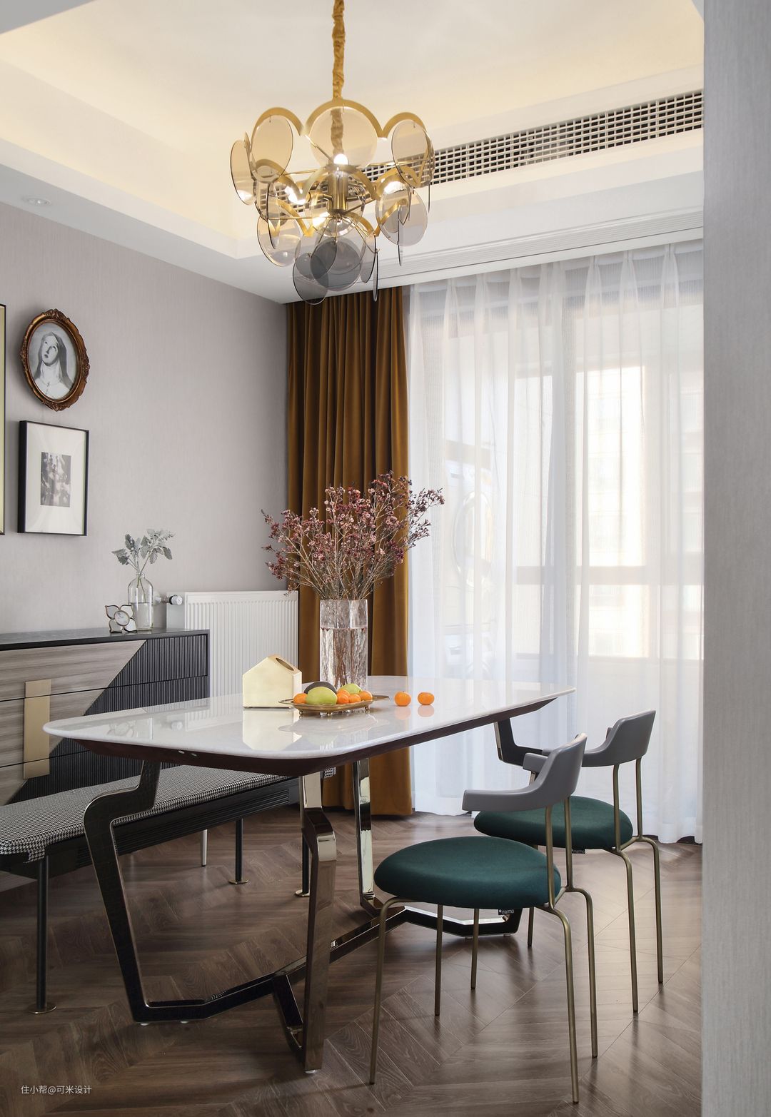 餐厅的吊灯由金色五金与烟灰色玻璃片组成,既时尚又高雅。餐桌椅搭配了餐桌、条凳和两把椅子的组合,就餐时可以变换不同的座位,夫妻俩都在家时可以一起坐条凳,更能增加彼此的亲密感。白色大理石餐桌造型优雅,增添了生活的品质感;餐椅由灰色、墨绿色与黄铜色搭配而成,将美学与舒适感融入其中,营造出轻松美妙的就餐氛围。