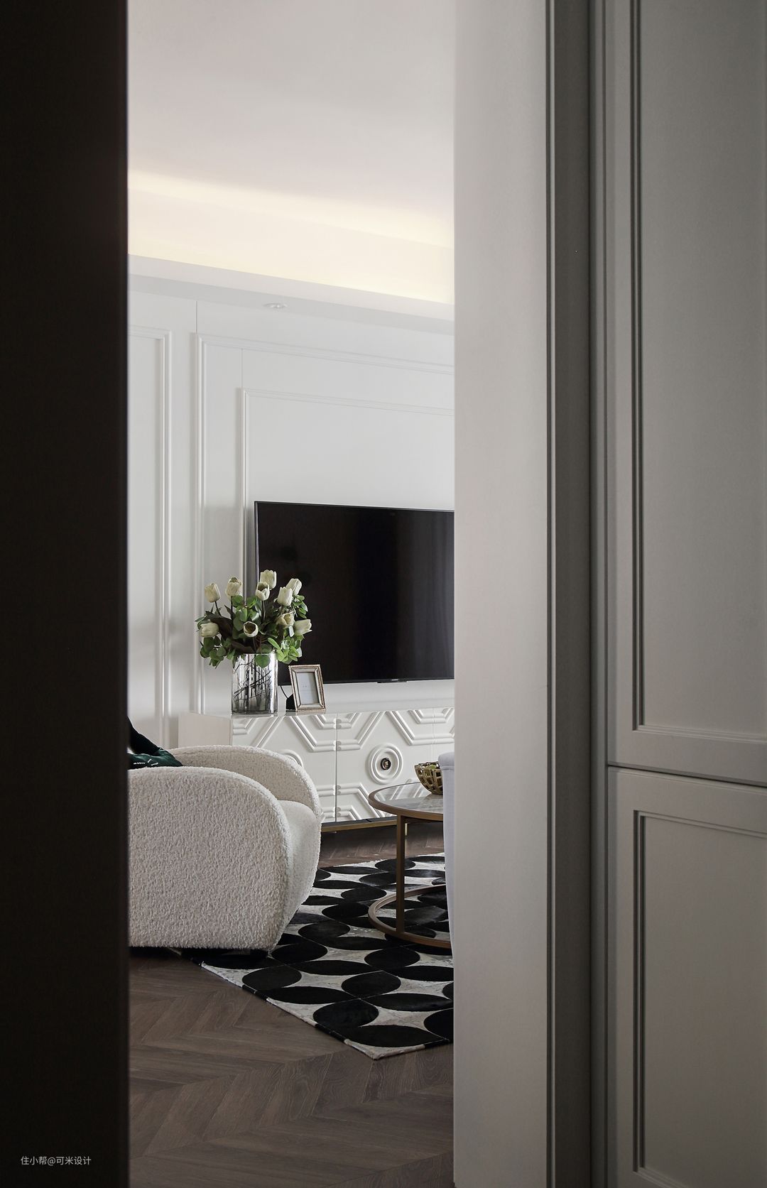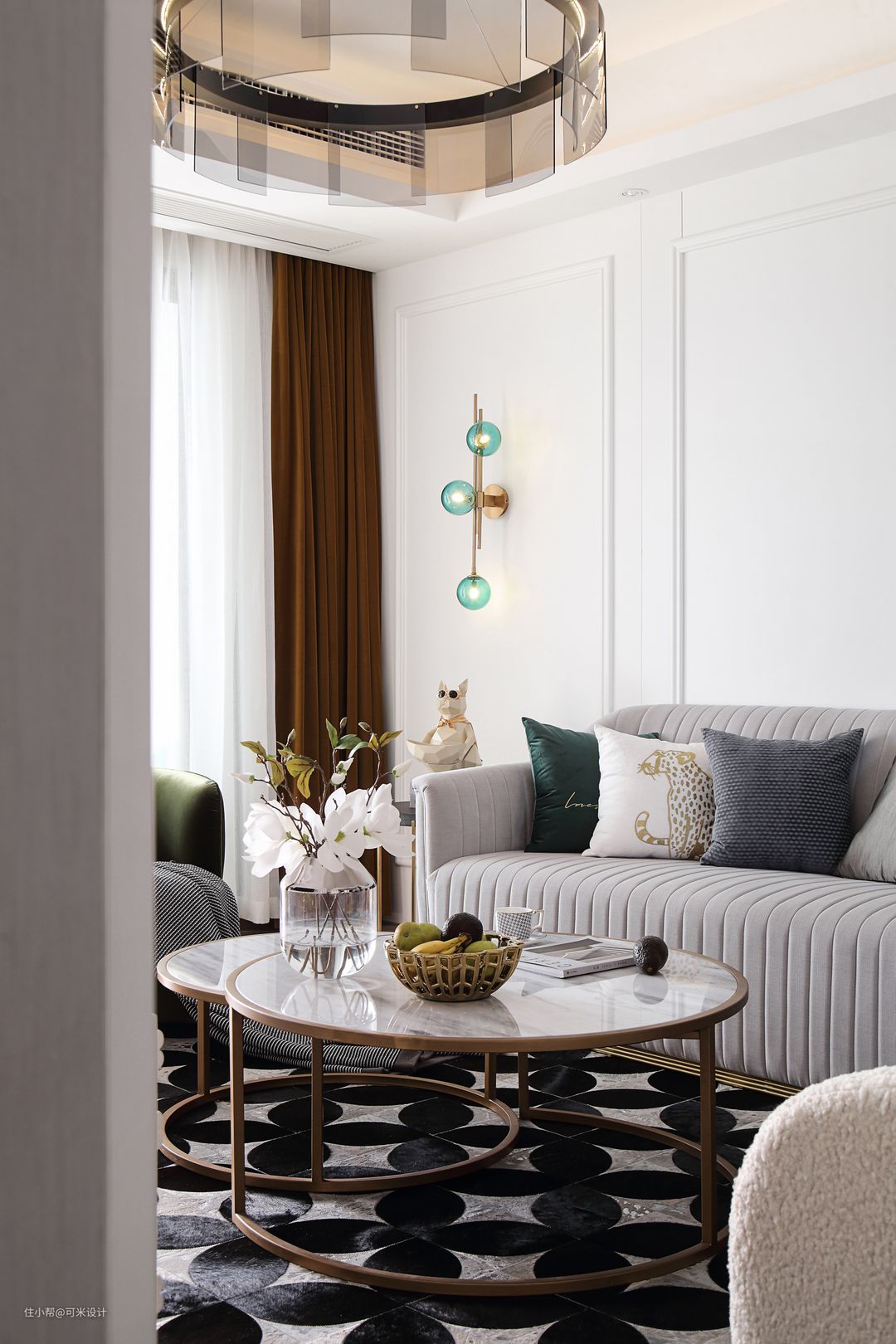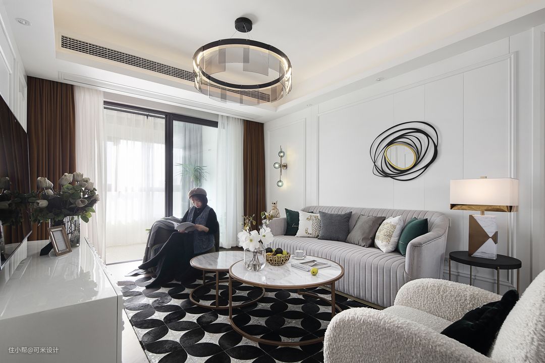 茶几是由大小不同的两个圆形组合而成,清爽而圆润,白色大理石配上金色柱脚,充满精致感。黑白两色的毛绒地毯,图案精美,提高了整屋的档次,又使得家居充满温馨感。