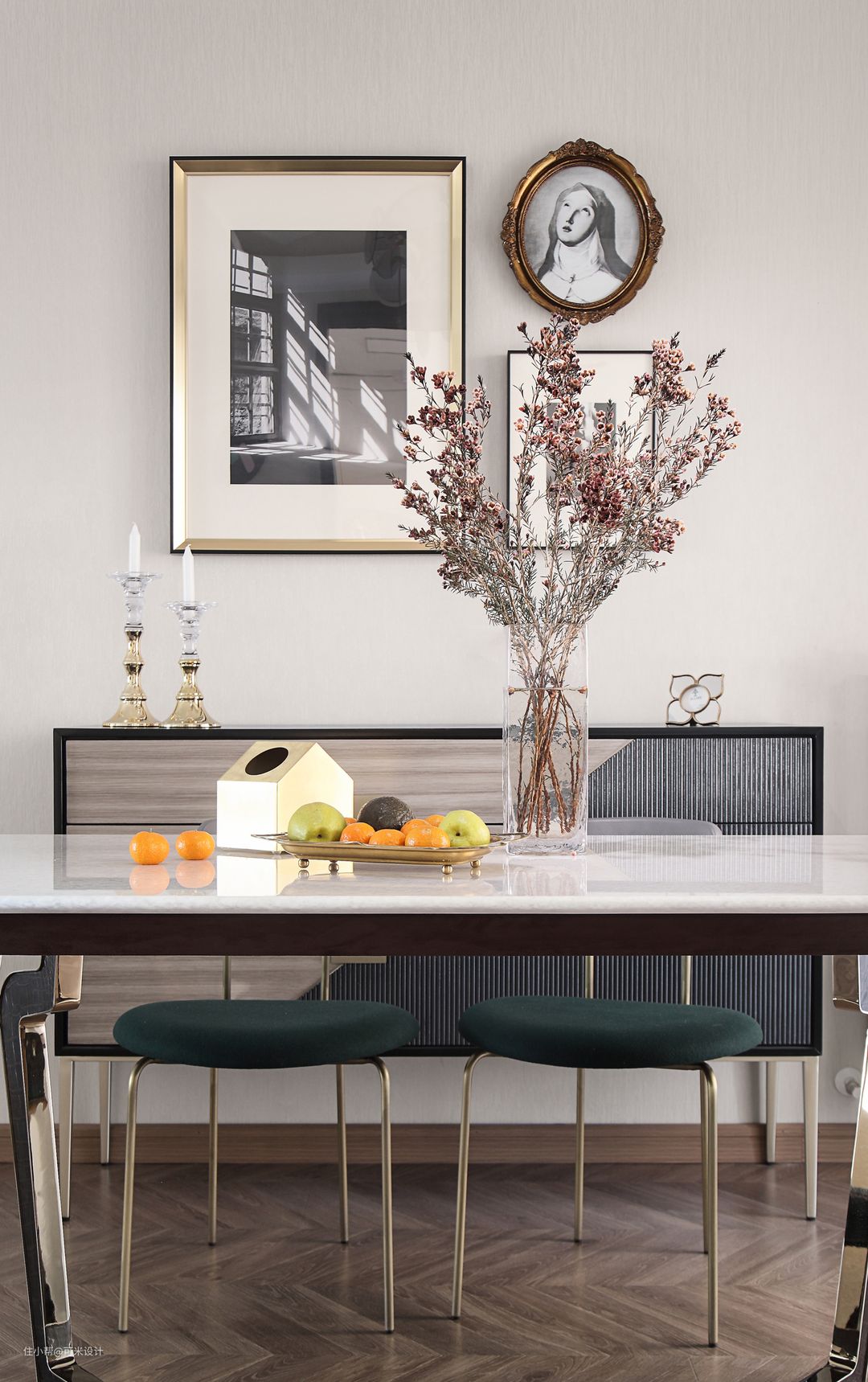 一抹绿的台灯,造型别致有格调;金色叶饰的相框,提升了屋内的档次,为整屋带来满满的精致感。