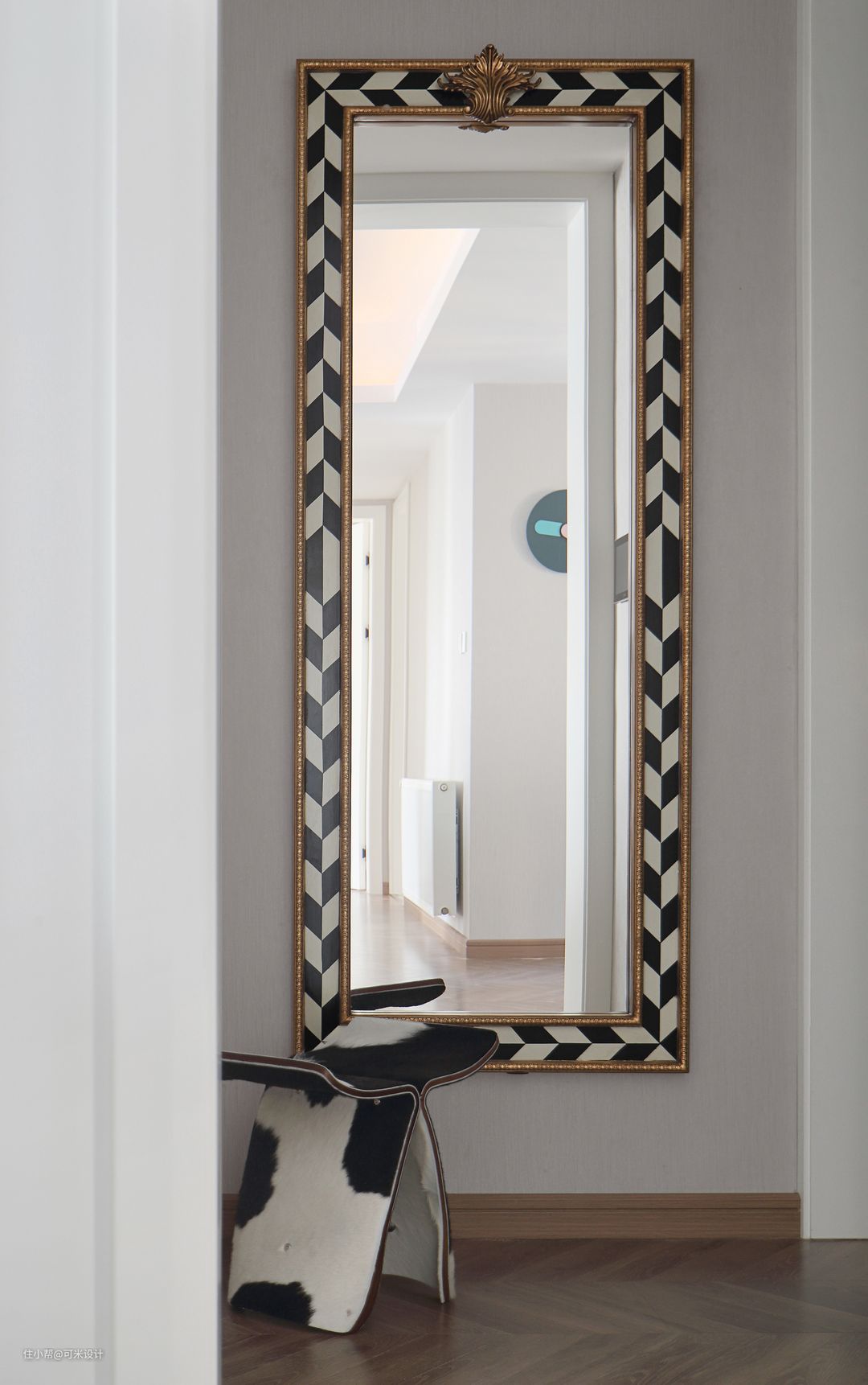 进入屋内即是玄关,墙上挂了一面1.8米高的全身镜,出门前方便在镜前整理好自己的妆容,黑白相间与金色组合而成的边框,整体显得大气而时尚。地上放置了一个ins风的蝴蝶凳,黑白色的天然奶牛毛皮,端庄优雅,充满潮流感。