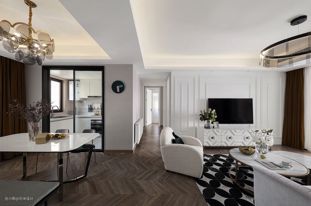 客厅与餐厅之间通过吊顶将两者划分开。整屋地面更换了咖色的鱼骨拼地板,庄重而不失雅致,为空间带来了层次感。