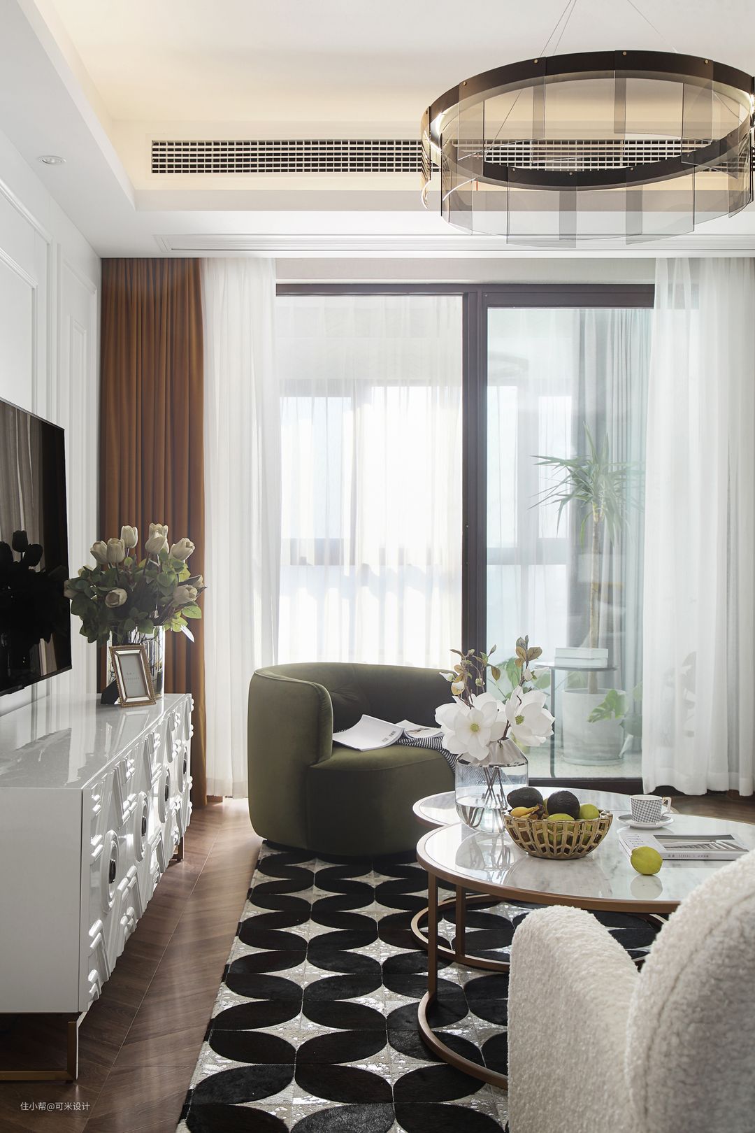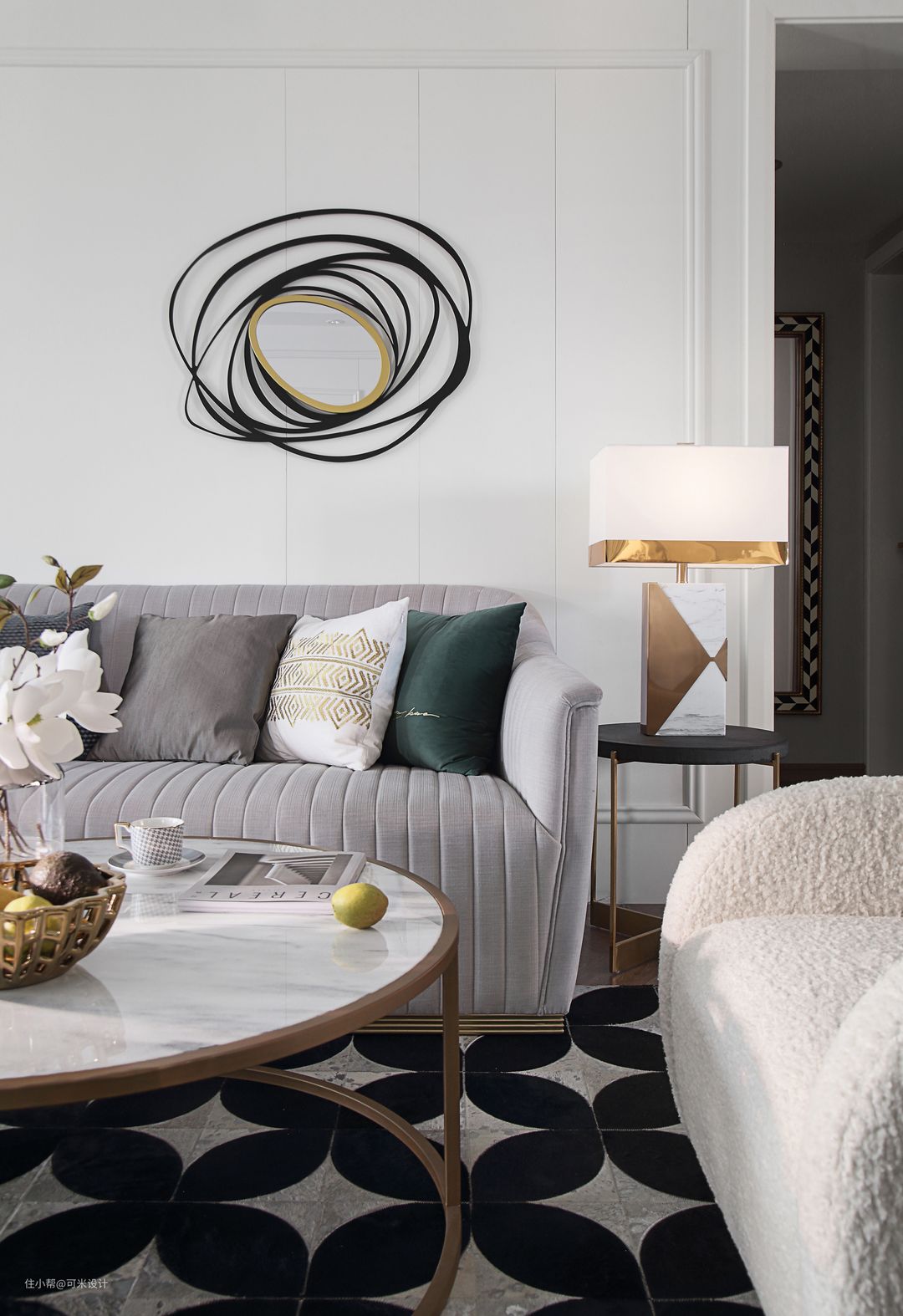 茶几是由大小不同的两个圆形组合而成,清爽而圆润,白色大理石配上金色柱脚,充满精致感。黑白两色的毛绒地毯,图案精美,提高了整屋的档次,又使得家居充满温馨感。