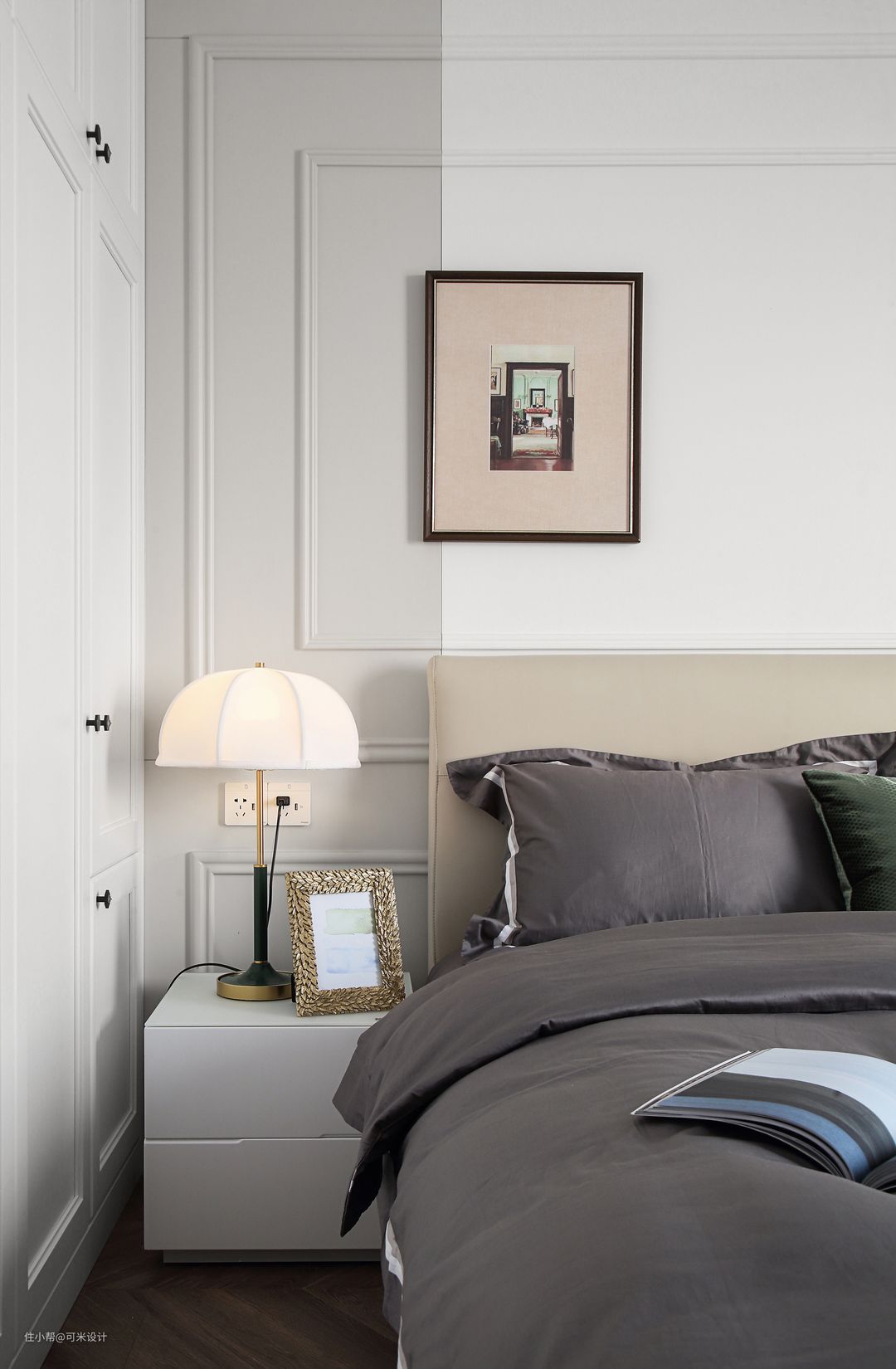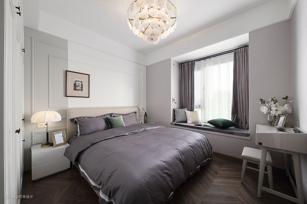 主卧吊灯选购了一款金色五金+白色玻璃的组合,整体干净清爽,充满高级感。床头背景的护墙板做了分色,白色搭配浅灰的跳色,给静谧的空间带来一丝时尚气息。墙上的挂画并没有挂在居中的位置,刚好靠近分色处,这样更能体现出整面墙的层次感。