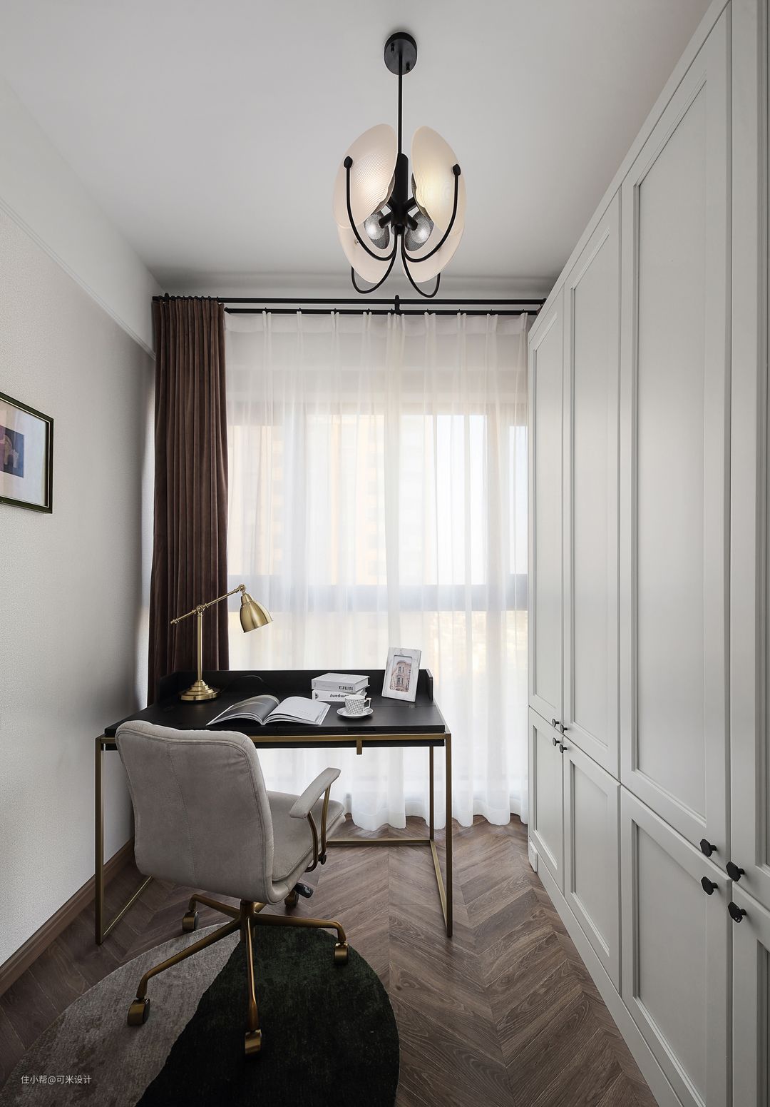 书房的一面墙定制了一排白色的柜子,与整屋色调统一,大大增加了屋内的收纳空间。书桌融合了实木与金属元素,简约大方;搭配的办公椅功能齐全,躺靠舒适,优雅大气。地上搭配的圆形地垫,为空间带来一丝暖意。