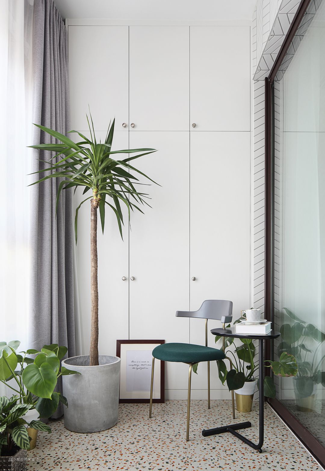 这是南阳台,主要作为休闲空间,地面铺设了彩色的水磨石,在光线照射的反射下,显得温暖而柔和,为空间增添了跳跃感。我们在一侧定制了白色的柜子,与整屋色调一致,增加了收纳空间。在此处种上一些绿植,闲暇时泡上一杯热咖啡,闻着杯中散发的缕缕清香,看着窗外的景致,也是生活的一种享受。